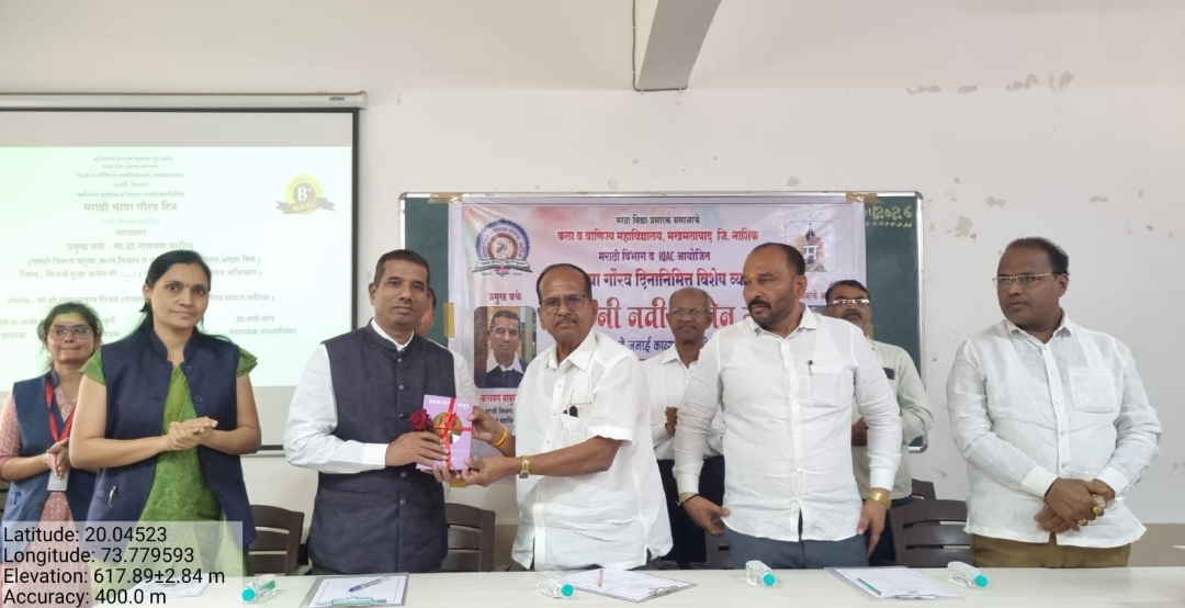 मध्ययुगीन महाराष्ट्राच्या प्रारंभिक काळात महानुभाव सांप्रदायातील आद्य कवयित्री महदंबा आणि वारकरी भक्ती चळवळीतील संत मुक्ताबाई, व संत जनाबाई या महान संत कवयित्रींनी केलेल्या काव्य रचना म्हणजे आधुनिक समाज परिवर्तनाची नांदी ठरल्या असे गौरवोद्गार प्रसिद्ध साहित्यिक व वक्ते डॉ. नारायण पाटील यांनी मखमलाबाद महाविद्यालयात केले . मखमलाबाद येथील मविप्र संचलित कला व वाणिज्य महाविद्यालयात आयोजित मराठी भाषा गौरव दिन कार्यक्रमात “फिरुनी नवी जन्मेन मी” या विषयावर प्रमुख वक्ते म्हणून श्री पाटील बोलत होते. अध्यक्षस्थानी मराठा विद्या प्रसारक संस्थेचे संचालक श्री रमेशआबा पिंगळे होते. तर मंचावर नाशिक महानगरपालिकेचे नवनिर्वाचित नगरसेवक श्री वाळूभाऊ काकड, शाळा व्यवस्थापन सदस्य श्री बाळासाहेब पिंगळे ,महाराष्ट्र अंधश्रद्धा निर्मूलन पत्रिकेचे सह संपादक श्री प्रल्हाद मिस्री आदि मान्यवर उपस्थित होते. आपल्या अभ्यासपूर्ण मनोगतातून डॉ. नारायण पाटील यांनी सांगितले की,ज्या काळात स्त्रियांना घराच्या बाहेर कोणतेही अधिकार नव्हते अशा तात्कालीन प्रतिकूल सामाजिक परिस्थितीतील महादंबा,मुक्ताई व जनाई यांनी समाजाचे प्रबोधन करून काव्यनिर्मिती केली अशा महान विभूतींच्या जीवनकार्याचा परामर्श घेत ओवी व अभंगांचे काव्यमय सादरीकरण केले. प्रारंभी महाविद्यालयाच्या प्राचार्य डॉ. मनीषा आहेर यांनी उपस्थित मान्यवरांचे स्वागत करून आपण कोणत्याही विषयाचे व शाखेचे शिक्षण घेतले तरी मातृभाषेच्या अभ्यासाशिवाय ते अपूर्ण असते असे सांगितले. अध्यक्षीय मनोगत व्यक्त करताना श्री रमेशआबा पिंगळे यांनी महाविद्यालयीन विद्यार्थ्यांनी मराठीतील चांगल्या साहित्यकृतींचे वाचन करून आपले व्यक्तिमत्व संपन्न करावे असे प्रतिपादन केले. मराठी विभाग प्रमुख प्रा. श्रीमती अर्चना धारराव यांनी कार्यक्रमाचे प्रास्ताविक करतांना कवीश्रेष्ठ कुसुमाग्रजांचे जीवन कार्य आणि ठळक साहित्य कृतींचा परिचय करून दिला. मराठी विभाग प्रा.वर्षा वाघ यांनी सूत्रसंचालन केले. यावेळी महाविद्यालयीन ग्रंथालयात आयोजित ग्रंथप्रदर्शनाचे उद्घाटन मान्यवरांच्या हस्ते संपन्न झाले. कार्यक्रमास महाविद्यालयातील सर्व विद्यार्थी ,प्राध्यापक व शिक्षकेतर सेवक मोठ्या संख्येने उपस्थित होते.