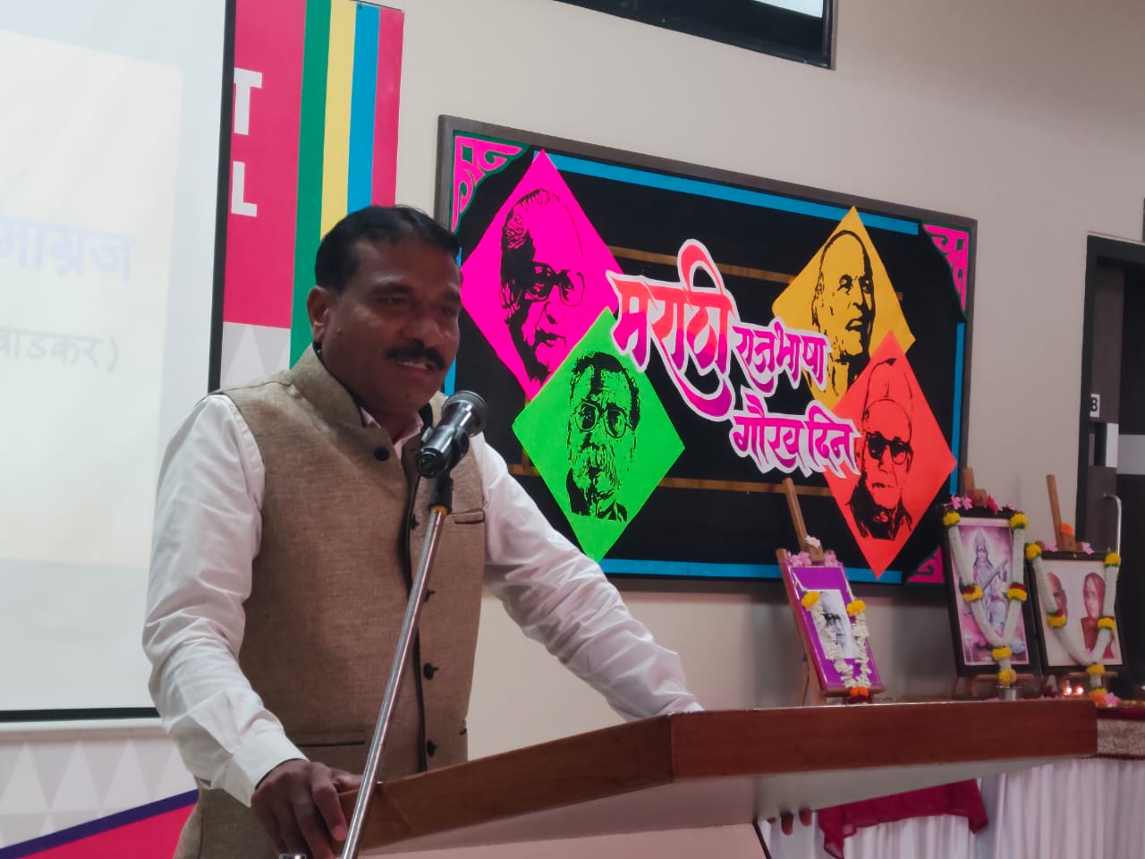 पुढे बोलताना प्राध्यापक जाधव म्हणाले परंपरा आणि संस्कृतिक वारसा टिकवून ठेवण्याचे कार्य भाषेच्या माध्यमातून मराठी यासाठी बोली भाषेचे योगदान फार महत्त्वाचे या बोलीभाषा टिकल्या नाहीत तर लोकसाहित्याचा खजिना नष्ट होण्याची भीती व्यक्त करून इंग्रजी भाषा ही जागतिक व्यवहाराची भाषा असली तरी मराठी भाषा ही ज्ञानभाषा आहे. यावेळी कवी कुसुमाग्रजांच्या साहित्याची ओळख त्यांनी आपल्या व्याख्यानातून करून दिली.