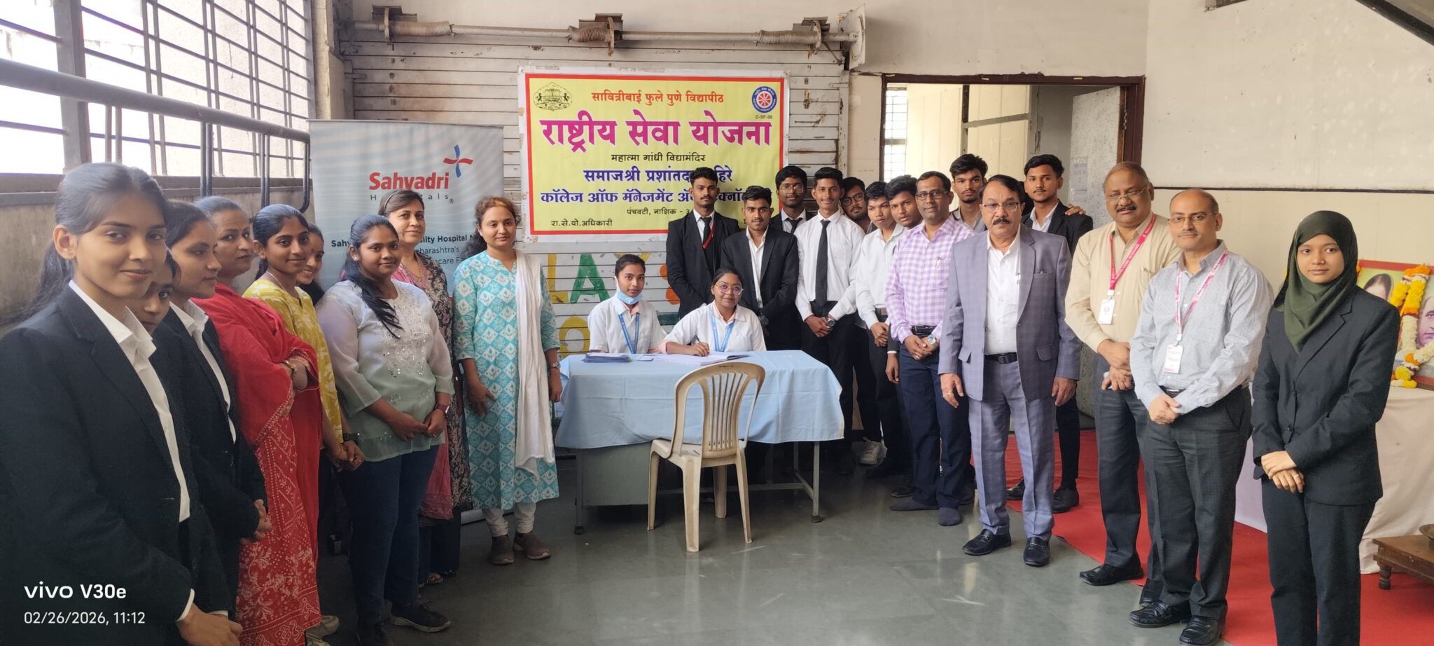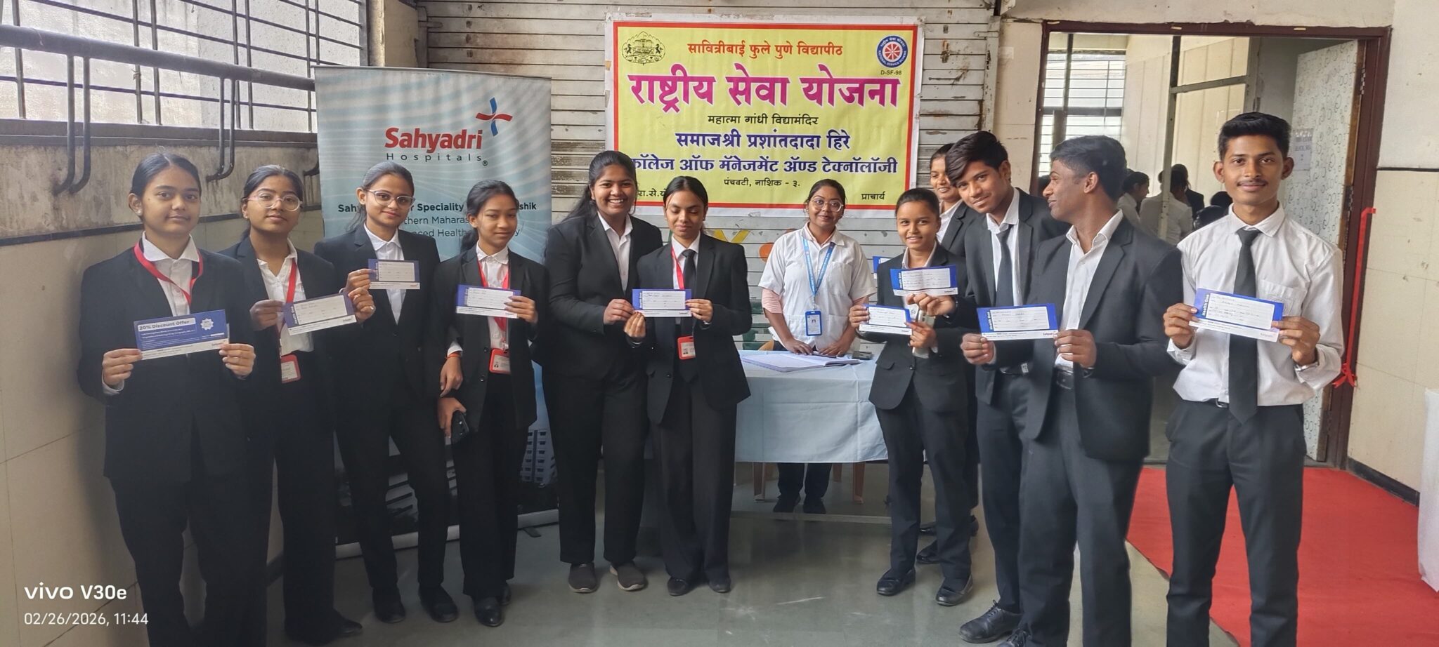 नाशिक (पंचवटी) : महात्मा गांधी विद्यामंदिर संचलित समाजश्री प्रशांतदादा हिरे कॉलेज ऑफ मॅनेजमेंट अँड टेकनॉलॉजी येथे “Health is Wealth” या संकल्पनेला प्रत्यक्षात उतरवत सह्याद्री हॉस्पिटल यांच्या सहकार्याने सर्व कर्मचारी व स्टाफसाठी मोफत मेडिकल चेकअप शिबिराचे आयोजन करण्यात आले. हा उपक्रम राष्ट्रीय सेवा योजना विभागामार्फत राबविण्यात आला.