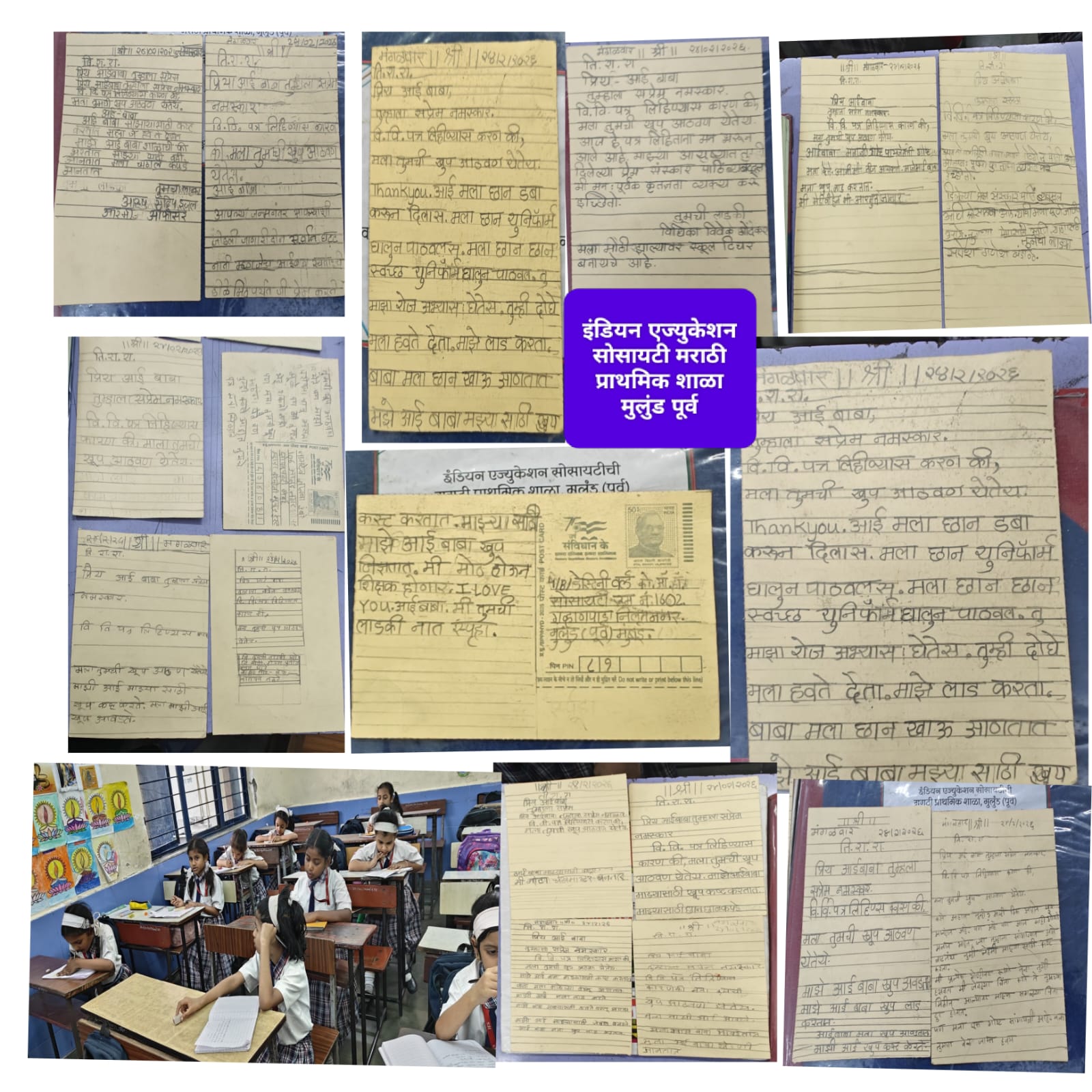 मुंबई (गुरुदत्त वाकदेकर) : मराठी भाषा दिनाचे औचित्य साधून इंडियन एज्युकेशन सोसायटीच्या मराठी प्राथमिक शाळा, मुलुंड पूर्व येथे विद्यार्थ्यांमध्ये पत्रलेखनाची कला रुजवण्यासाठी विशेष उपक्रम राबविण्यात आला. इयत्ता दुसरी ते चौथीच्या विद्यार्थ्यांकडून वर्गावर्गात पत्रलेखन करून घेण्यात आले.