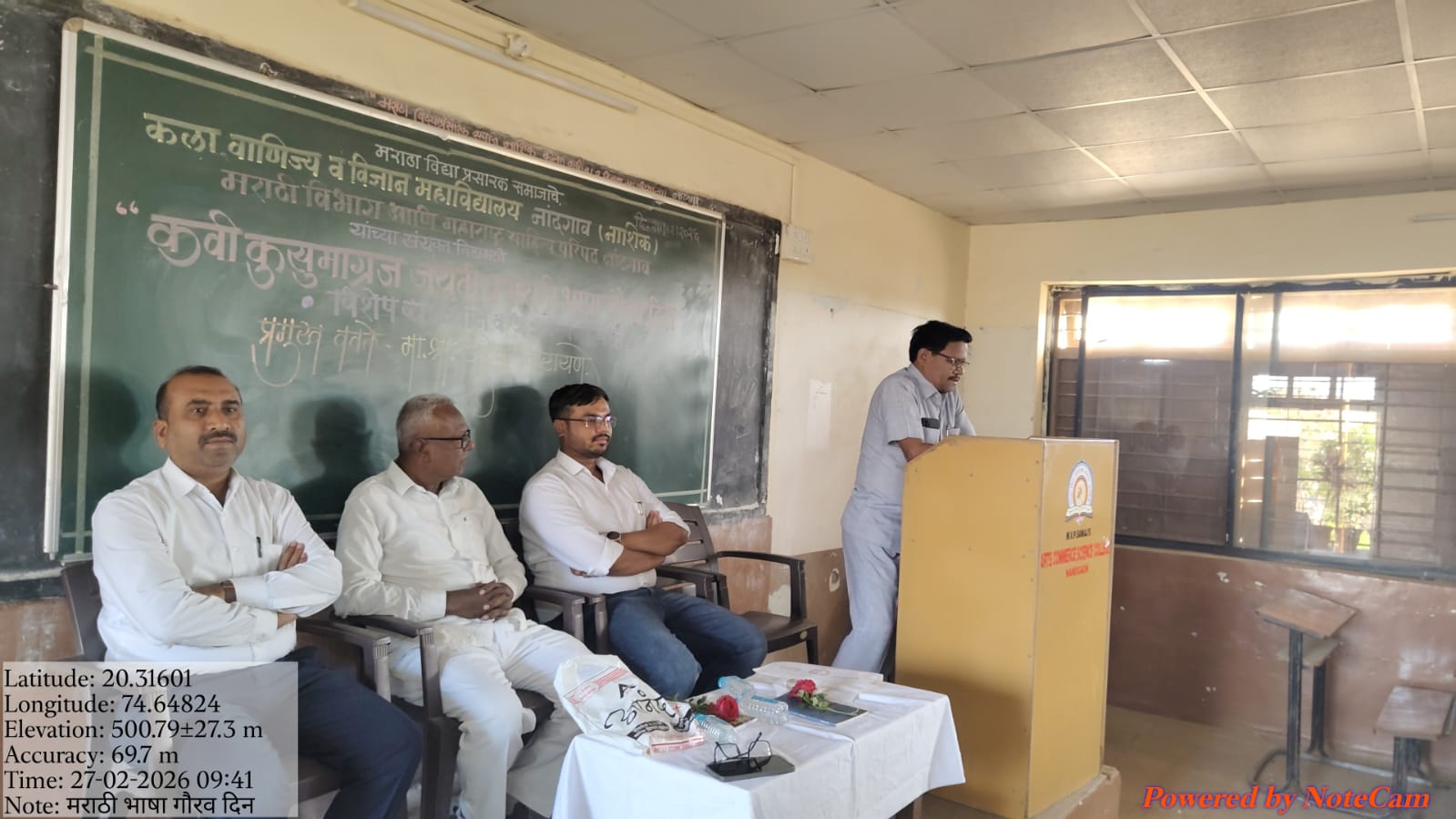 मराठी विभागप्रमुख प्रा. योगेश वाघ यांनी प्रास्ताविकातून मराठी भाषा गौरव दिनाची पार्श्वभूमी स्पष्ट करत कवी कुसुमाग्रज यांच्या साहित्याची आणि जीवनाची ओळख करून दिली. सोबतच सर्व मराठी भाषिकांनी कुसुमाग्रजांसम अंतराळात अढळपद मिळविण्यासाठी प्रयत्नशील असावे असे प्रतिपादन केले. अध्यक्षीय मनोगतातून उपप्राचार्य डॉ. संजय मराठे यांनी मराठी भाषेचे महत्त्व व आपल्या जीवनातील स्थान स्पष्ट केले. कार्यक्रमासाठी डॉ. बाबाजी आहिरे, प्रा. ए. एफ. राठोड, प्रा. एम. बी. आटोळे, डॉ. डी. डी. ठाकरे, प्रा. ए. बी. जाधव, प्रा. डी. वाय. तुंगार, प्रा. शिंदे आणि कला व वाणिज्य शाखेचे विद्यार्थी उपस्थित होते. प्रा. श्रीमती छाया आहिरे यांनी कार्यक्रमाचे सूत्रसंचालन केले. आभार भूगोल विभागाचे डॉ. बाबाजी आहिरे यांनी मानले. सदर कार्यक्रम यशस्वी होण्यासाठी मा. प्राचार्य डॉ. एन. यु. पाटील, सर्व प्राध्यापक, शिक्षकेतर कर्मचारी आणि विद्यार्थी यांचे सहकार्य लाभले.