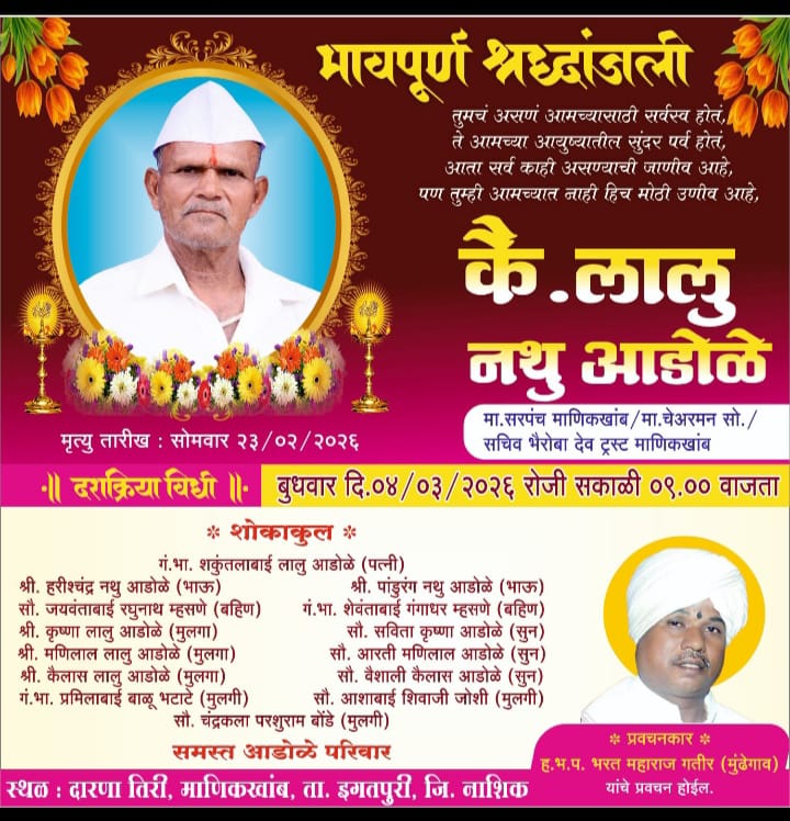माणिकखांब, ता. ईगतपुरी येथील प्रगतशील शेतकरी, राजकिय , सामाजिक व धार्मिक क्षेत्रात आपल्या कर्तृत्वाचा ठसा उमटवणारे कै. लालु पाटिल आडोळे यांचे नुकतेच निधन झाले आहे.
