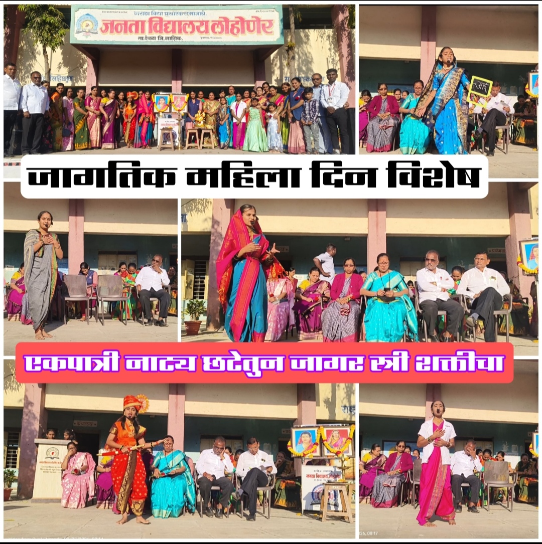 लोहोणेर-( प्रतिनिधी): येथील मराठा विद्या प्रसारक समाज संस्थेच्या जनता विद्यालयात जागतिक महिला दिन उत्साहपूर्ण वातावरणात मुख्याध्यापिका कल्पना शिंदे यांच्या मार्गदर्शनाखाली साजरा करण्यात आला.कार्यक्रमाची सुरुवात राजमाता जिजाऊ व क्रांतीज्योती सावित्रीबाई फुले यांच्या प्रतिमा पूजनाने करण्यात आली.