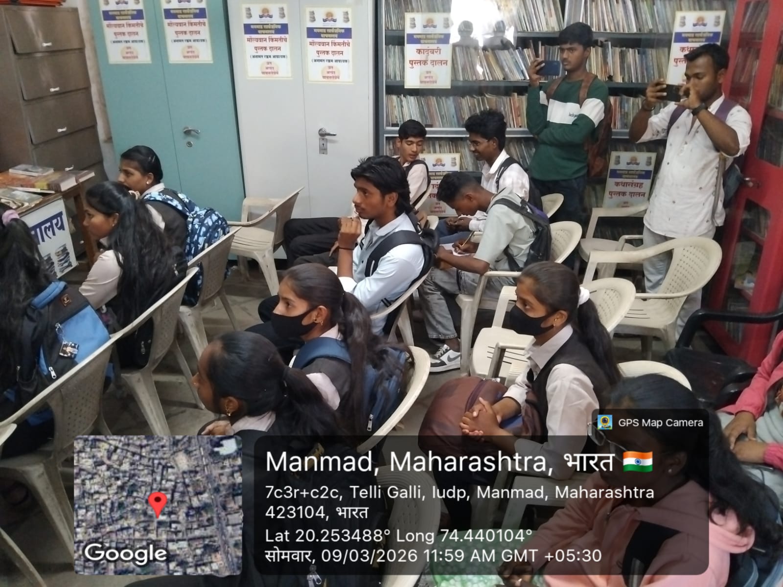 ऐतिहासिक,नाटक,कथासंग्रह कादंबरी,क्रीडा,कायदा विषयक आरोग्य,सामाजिक, धार्मिक, मराठी भाषा, विविध विश्वशब्दकोश, चरित्र ग्रंथ,मराठी व्याकरण, निबंध विषयी संबंधित तसेच स्पर्धा परीक्षा विषयी या सह मराठी भाषा संदर्भातील मोठी ग्रंथ संपदा विध्यार्थ्यांना पहाणे साठी व वाचणे साठी उपलब्ध करून देण्यात आली होती महाविद्यालय तील विध्यार्थी नी ह्या ग्रंथ संपदेची माहिती जाणून घेतली यावेळी महाविद्यालयाचे प्रा विजय पांगुळ यांनी मनमाड सार्वजनिक वाचनालयचे या क्षेत्र भेट साठी आभार प्रगट केले