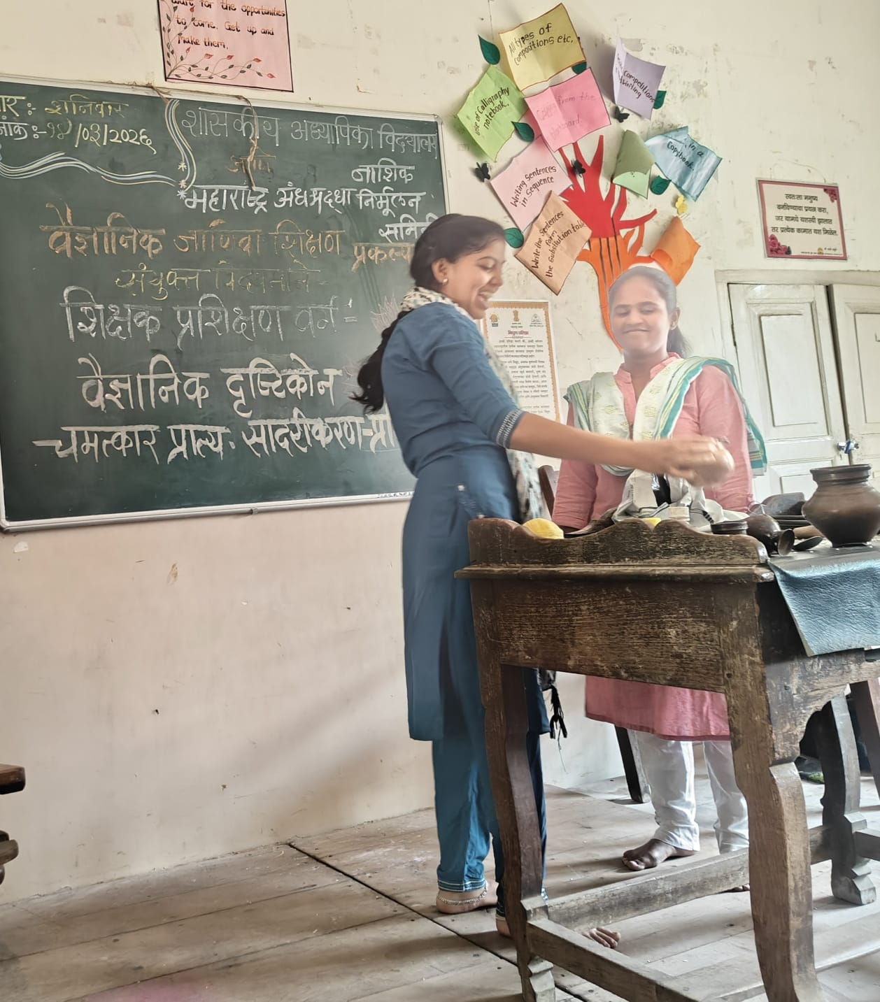 नाशिक- जिल्हा कोर्टासमोरील शासकीय अध्यापिका विद्यालयात महाराष्ट्र अंधश्रद्धा निर्मूलन समितीच्या वैज्ञानिक जाणीवा शिक्षण प्रकल्पांतर्गत अध्यापिकांना वैज्ञानिक दृष्टिकोन व चमत्कार प्रात्यक्षिक सादरीकरण आणि प्रशिक्षण देण्यात आले.