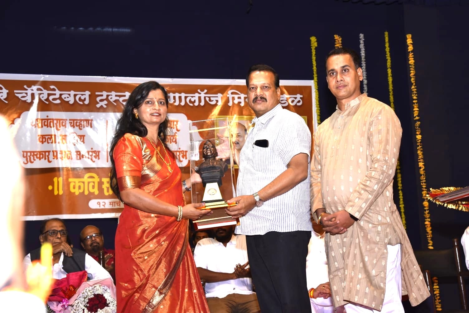 नांदगाव ( प्रतिनिधी ) नांदगाव जि. नाशिक येथील सुप्रसिद्ध कवयित्री सौ.प्रतिभा पवार-खैरनार यांच्या वंशावळीच्या प्राचीन सरीतून या कवितासंग्रहास पुणे येथील स्वर्गीय प्रकाश ढेरे चॅरिटेबल ट्रस्ट व गंगा लॉज मित्र मंडळ यांच्या वतीने दरवर्षी देण्यात येणाऱ्या प्रतिष्ठेचा यशवंतराव चव्हाण साहित्य पुरस्काराने सन्मानित करण्यात आले. या पुरस्काराचे हे ४० वे वर्षे आहे. दि.१२ मार्च रोजी टिळक स्मारक मंदिर पुणे येथे पुरस्काराचे वितरण करण्यात आले. मा. ना. सुनीलजी टिंगरे यांच्या शुभहस्ते आणि विजय ढेरे, दत्ता धनकवडे, सचिन जाधव, मोहन जोशी, संजय ढेरे, रामदास फुटाणे, गौरव फुटाणे, माधव गोगावले ( अमेरिका) भरत दौंडकर, अभिनेता महेश कोठारे इत्यादी मान्यवरांच्या उपस्थित झाले. सदरच्या पुरस्काराचे स्वरूप रोख रक्कम ११ हजार रुपये,सन्मानचिन्ह व सन्मानपत्र असे आहे. प्रतिभा पवार-खैरनार यांच्या या कवितासंग्रहास यापूर्वी पद्मश्री नामदेव ढसाळ काव्यप्रतिभा पुरस्कार व पद्मश्री नारायण सुर्वे उत्कृष्ट साहित्य पुरस्कार असे मानाचे साहित्य पुरस्कार त्यांना मिळाले आहेत. सदरच्या कवितासंग्रहाची अनेक वाड्मयीन जाणकारांनी प्रसंशा केली असून यासंदर्भात नियतकालिकातून समीक्षा लेखन प्रसिद्ध झाले आहे. हा कवितासंग्रह सध्या साहित्य वर्तुळात चर्चेच्या केंद्रस्थानी आहे. खैरनार यांचा हा तिसरा कवितासंग्रह असून एक कथासंग्रह त्यांच्या नावावर आहे. यशवंतराव चव्हाण साहित्य पुरस्कार जाहीर झाल्याने प्रतिभा पवार-खैरनार यांचे सर्वत्र अभिनंदन होत आहे.
