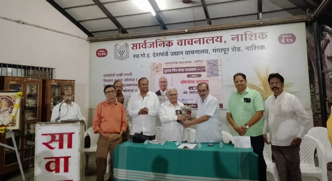 नाशिक (प्रतिनिधी) सार्वजनिक वाचनालय,नाशिकच्या पुस्तक मित्र मंडळात ॲड. मिलिंद चिंधडे यांचे नुकतेच त्यांच्या “वकिलीच्या अंतरंगात “या पुस्तकावर व्याख्यान संपन्न झाले. हे पुस्तक 61 वकील,न्यायाधीशांच्या आत्मचरित्रांवरचे पुस्तक म्हणजे पुस्तकांवरचे पुस्तक आहे. व्याख्यानात सुरुवातीला त्यांनी त्यांच्या काळात केलेल्या पुस्तक मित्र मंडळाच्या उपक्रमाबद्दलही सांगितले.