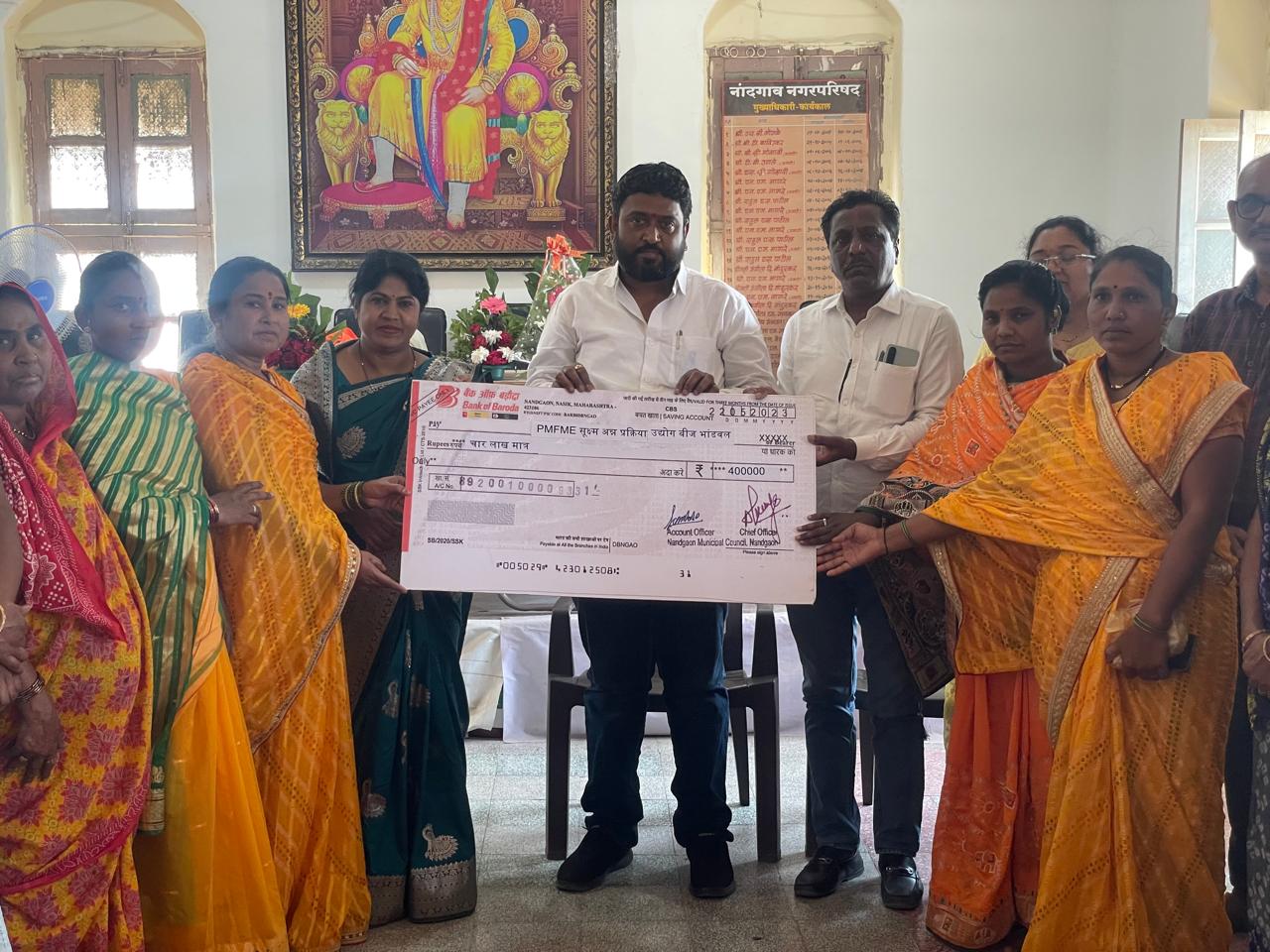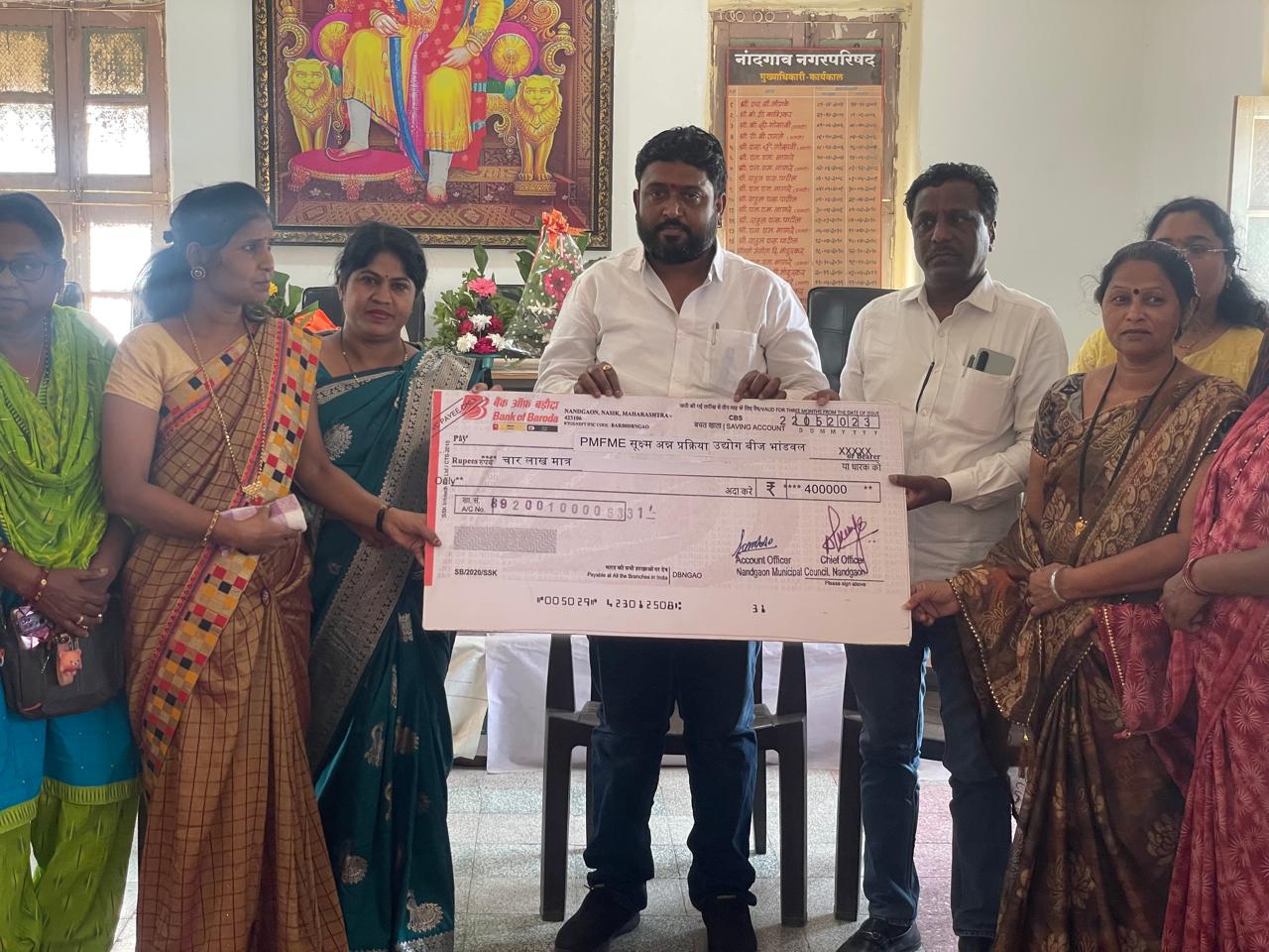 नांदगाव (प्रतिनिधी ) दिनांक 27/03/2026 रोजी मा.नगराध्यक्ष सागर भाऊ हिरे यांच्या अभिष्टचिंतन सोहळ्यानिमित्त नांदगाव नगरपरिषद नांदगाव संचलित स्री शक्ती शहर स्तर संघ (CLF)अंतर्गत PMFME(खाद्य पदार्थ )या योजनेअंतर्गत 3 बचत गटांना सप्तश्रृंगी,मुक्ता,संग्राम असे प्रती 4 लाख याप्रमाणे कर्ज मंजूर करून माननीय नगरअध्यक्ष सागर भाऊ हिरे ,महिला व बालकल्याण सभापती एडवोकेट विद्याताई कसबे नांदगाव नगर परिषदेचे मुख्याधिकारी माननीय जाधव साहेब यांच्या हस्ते उपस्थित महिला बचत गटांना चेक वाटप करण्यात आले