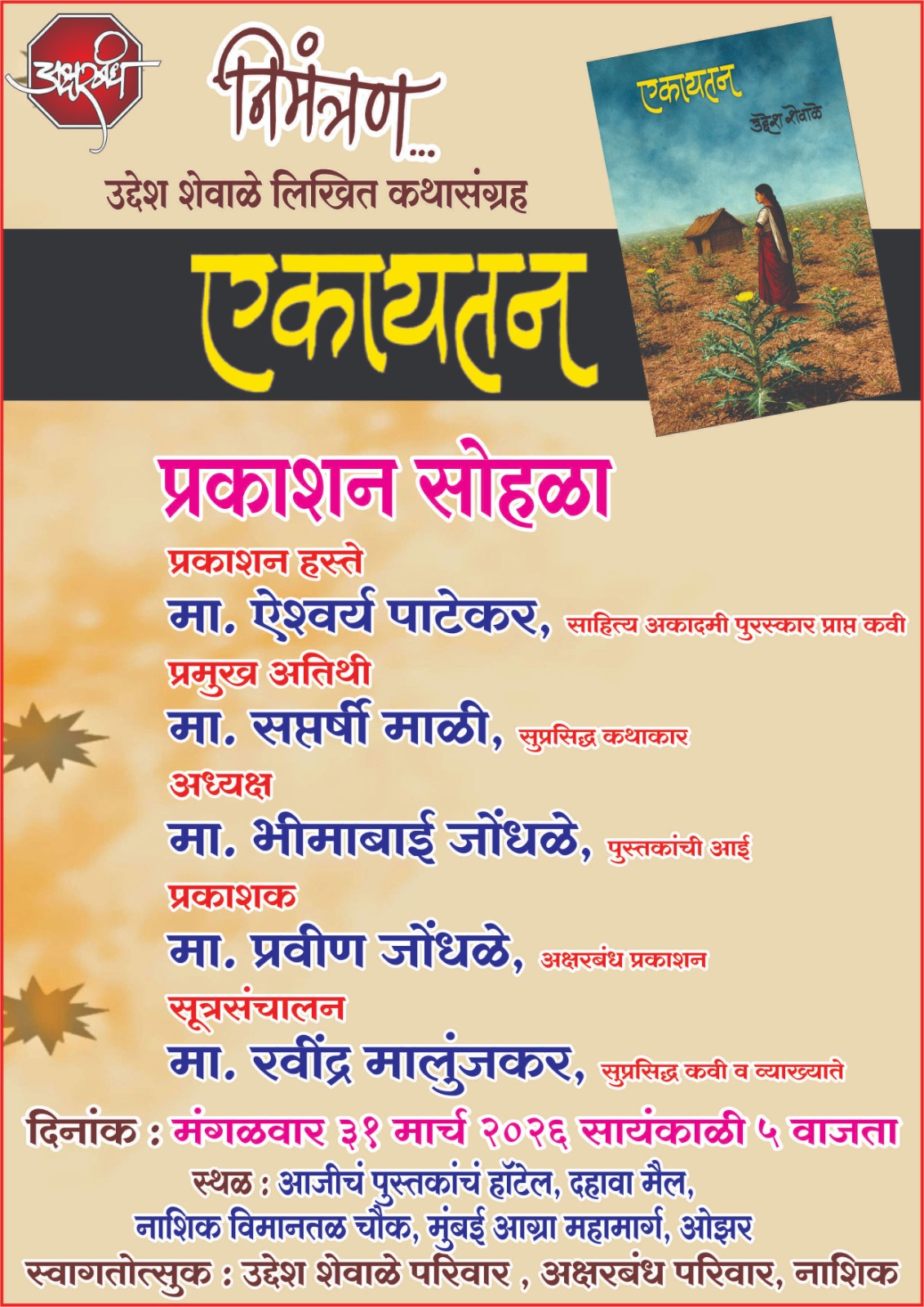 नाशिक (प्रतिनिधी) नाशिकरोड येथील उद्देश शेवाळे लिखित आणि अक्षरबंध प्रकाशित ‘एकायतन’ कथासंग्रहाचे प्रकाशन मंगळवार (दि. 31) रोजी साहित्य अकादमी पुरस्कारप्राप्त कवी प्रा.ऐश्वर्य पाटेकर यांच्या हस्ते आजीचं पुस्तकांचं हॉटेल येथे सायं. 5 वाजता होणार आहे.