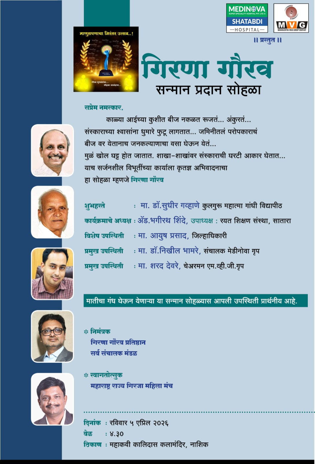 महाकवी कालिदास कलामंदिर, नाशिक येथे रविवार ५ एप्रिल, २०२६ रोजी सायंकाळी ५ वा. या पुरस्काराचे वितरण होणार असून या कार्यक्रमास उपस्थित राहण्याचे आवाहन गिरणा गौरव प्रतिष्ठान आणि महाराष्ट्र राज्य गिरजा महिला मंचच्या वतीने करण्यात आले आहे.