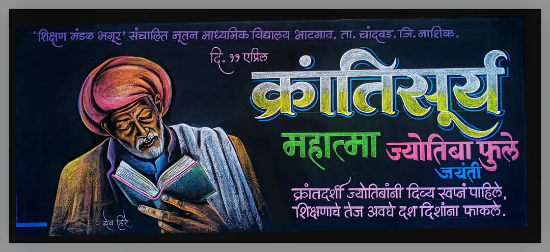 दि. ११ एप्रिल २०२५*महात्मा ज्योतिबा फुले जयंती* समाजाचे दगड धोंडे आपल्या अंगावर घेत या राष्ट्राला शिक्षणाचे महत्त्व पटवून देणारे सामाजिक कार्यकर्ते, विचारवंत, समाज सुधारक आणि लेखक तसेच सामाजिक प्रबोधन, अस्पृश्यता व जातीय व्यवस्थेचे निर्मूलन आणि स्त्रियांना व मागास जातीच्या लोकांना शिक्षण देण्याचे बहुमूल्य कार्य करणारे क्रांतीसुर्य ज्योतीराव गोविंदराव फुले यांची आज जयंती. सामाजिक न्याय व सामाजिक पुनर्रचनेची मागणी करत गुलामगिरी विरुद्ध आवाज उठवत पुण्याला मुलींची पहिली शाळा सुरू करून शिक्षणाचा प्रकाश दाही दिशांना पोहोचवण्याचे बहुमूल्य कार्य करणाऱ्या या महान क्रांतिसूर्यास जयंती निमित्त रंगीत खडू माध्यमातील फलक रेखाटनातून कोटी कोटी वंदन व अभिवादन !