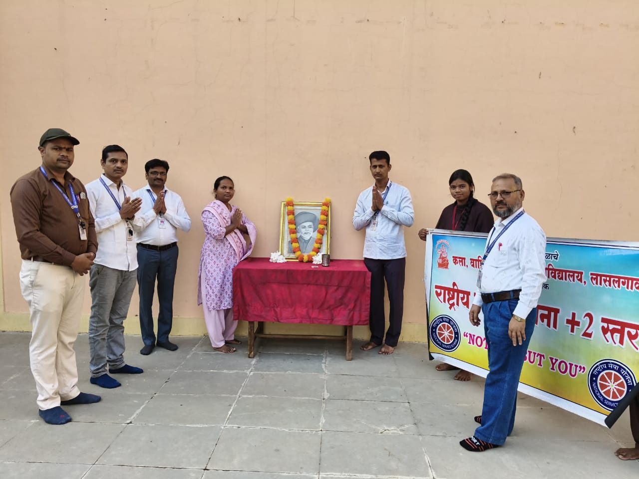 लासलगाव, ता. ११ ( प्रतिनिधी ) : येथील नूतन विद्या प्रसारक मंडळ संचलित कला, वाणिज्य व विज्ञान महाविद्यालयात दिनांक ११ एप्रिल २०२५ रोजी राष्ट्रीय सेवा योजना विभागाच्या वतीने महात्मा ज्योतिबा फुले यांची १९८ वी जयंती साजरी करण्यात आली. याप्रसंगी उच्च माध्यमिक विभागाचे पर्यवेक्षक प्रा.उज्वल शेलार, राष्ट्रीय सेवा योजना कार्यक्रमाधिकारी प्रा.देवेंद्र भांडे, प्रा.सुनिल गायकर, प्रा.प्रभाकर गांगुर्डे, प्रा.रामसिंग वळवी, प्रा.लता तडवी, यांच्या हस्ते पुष्पहार अर्पण करून अभिवादन करण्यात आले. याप्रसंगी रा.से.यो. स्वयंसेवक अविनाश खरात आणि उच्च माध्यमिक विभागाचे पर्यवेक्षक प्रा.उज्वल शेलार यांनी आपले मनोगत व्यक्त केले. तर कल्याणी ठोके या विद्यार्थिनीने आभार मानले.
