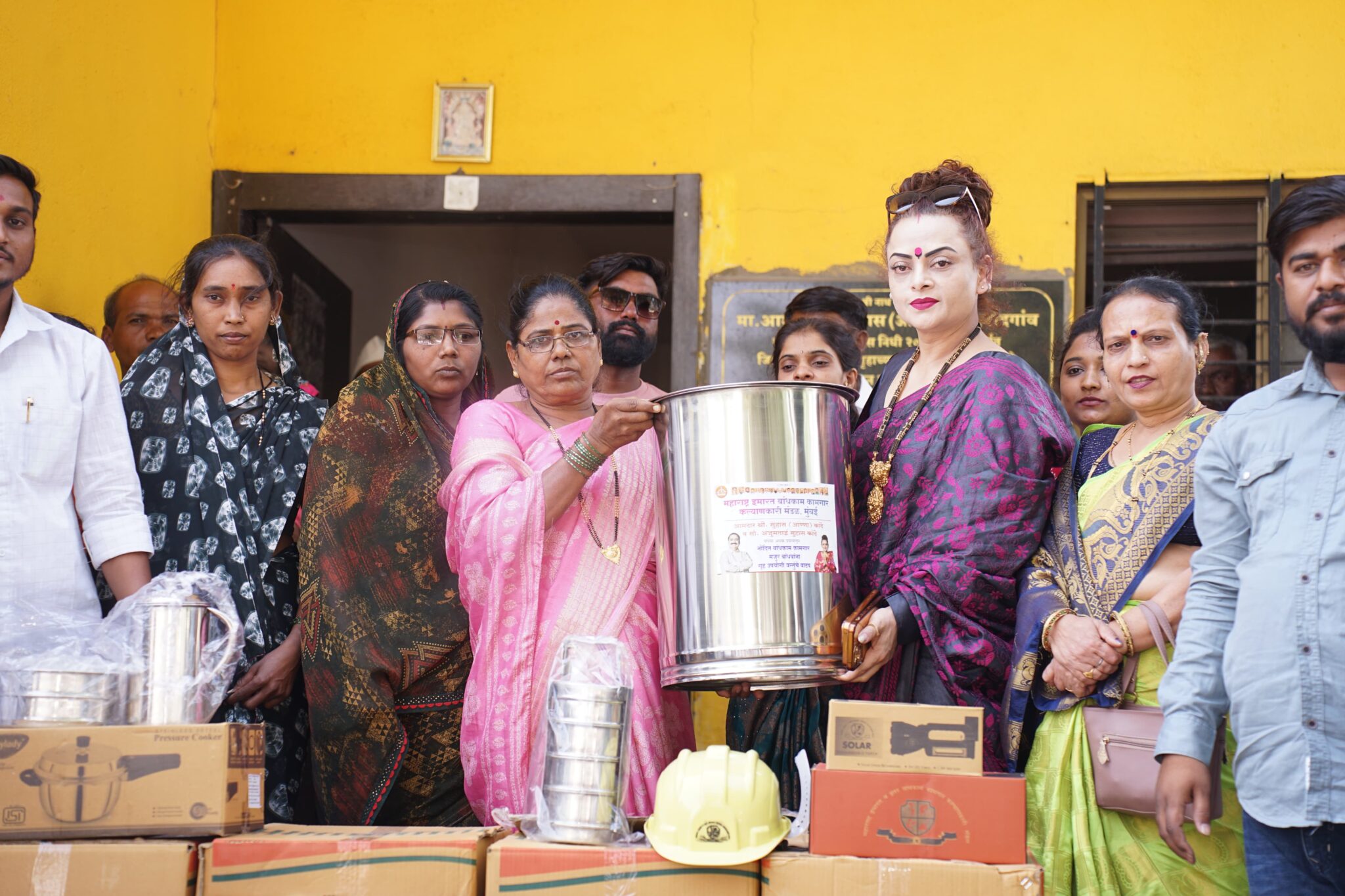इमारत व इतर बांधकाम कामगार कल्याणकारी मंडळाकडून नोंदणीकृत कामगारांना दिल्या जाणाऱ्या ग्रह उपयोगी वस्तूचा संच कामगारांना देताना समाजसेविका सौ अंजुमताई कांदे यांच्यासह शिवसेनेचे महिला पदाधिकारी आदी (छाया महेंद्र पगार )