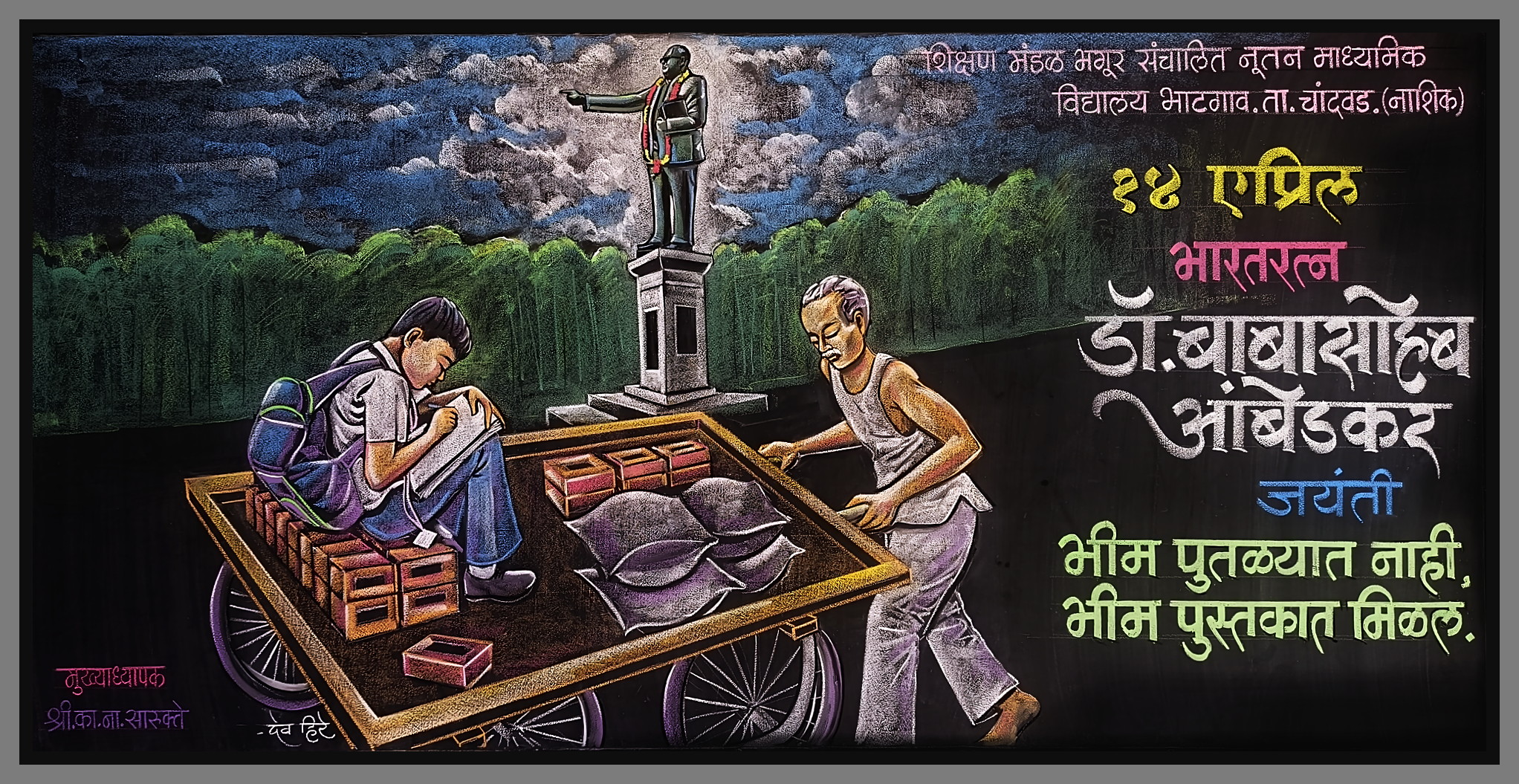 दि.१४ एप्रिल २०२५ *भीम जयंती*”भीम पुतळ्यात नाही, भीम पुस्तकात मिळल !” कला शिक्षक देव हिरे यांचे बाबासाहेबांना शालेय फळ्यावर रंगीत खडू माध्यमातून अनोखं अभिवादन. “भीम पुतळ्यात नाही, भीम पुस्तकात मिळतो” या अर्थपूर्ण संदेशातून डॉ. बाबासाहेब आंबेडकरांचा विचार आणि कार्य समजून घेण्याचा नवा प्रयत्न भाटगाव (ता. चांदवड) येथील भगूर शिक्षण मंडळ संचलित नूतन माध्यमिक विद्यालयात पाहायला मिळतो आहे. विद्यालयाचे कला शिक्षक देव हिरे यांनी साकारलेले हे सर्जनशील फळाचित्र केवळ एक कलाकृती नसून बाबासाहेबांच्या विचारांचे जिवंत दर्शन आहे.कष्टकरींच्या प्रेरणेचं वास्तव चित्रणया चित्रातून असंख्य कष्टकरी पालक आपली मुलं शिकवण्यासाठी झटत असल्याचं वास्तव मांडलं गेलं आहे. बाबासाहेबांनी दाखवलेल्या शिक्षणाच्या मार्गावर चालत ही मंडळी आपल्या लेकरांच्या हातात झाडू नव्हे, तर पुस्तक देण्याचा प्रयत्न करताना दिसत आहेत. डॉ. बाबासाहेब आंबेडकर यांच्या जयंतीच्या पूर्वसंध्येला हे फळाचित्र म्हणजे त्यांना अनोख अभिवादन ठरत आहे. हे फलक रेखाटण विद्यार्थ्यांसह समाजालाही विचार करायला भाग पाडणारे ठरत आहे.