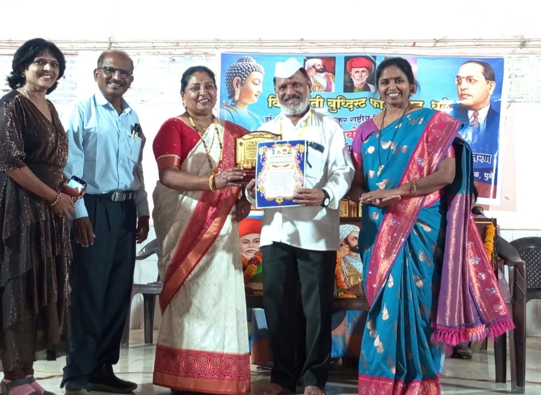 पिंपळनेर [ प्रतिनिधी ] विश्वशांती बुध्दिस्ट फाऊंडेशन भारतरत्न डॉ. बाबासाहेब आंबेडकर राष्ट्रीय शिक्षक अकादमी धुळे शहर यांचा बहुमानांकित , बहुचर्चित , सदैव चर्चेत असलेला, बहुसंख्य प्रस्तावातून निवडक साहित्यिकांना दिला जाणारा राज्यस्तरीय डॉ. बाबासाहेब आंबेडकर राष्ट्रीय साहित्य भुषण पुरस्कार २०२५ नुकताच राज्य सरकारी कल्यान भवन शिवतिर्थ धुळे येथील सभाग्रहात उत्साही वातावरणात खान्देशातील गावगाडाकार कवी लेखक संपादक श्री साहेबराव नंदन [ तात्या ] ताहाराबादकर नाशिक यांना संस्थेचे संस्थापक अध्यक्ष मा. भास्करराव अमृतसागर, साहित्यिका कवयित्री मुंबईच्या आशाताई ब्राम्हणे यांच्या शुभ हस्ते टाळ्यांच्या कडकडाटात प्रदान करून, सन्मानित करण्यात आले. या प्रसंगी राज्यभरातील बहुसंख्य साहित्यिक आणि जेष्ठ विचारवंत उपस्थित होते. साहेबराव तात्यांना मिळालेल्या पुरस्काराचे राजकीय, सामाजिक, शैक्षणिक, सांस्कृतिक अध्यात्मिक क्षेत्रातून व सामाजिक संस्थांनी अभिनंदनाचा वर्षाव करत आनंद व्यक्त केला आहे.