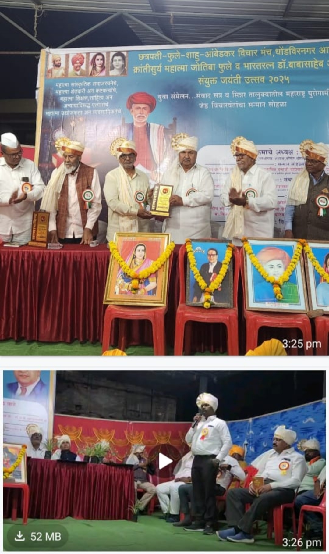 सायंकाळी सात वाजता युवा- संमेलन… संवाद सत्र व सिन्नर तालुक्यातील महाराष्ट्र पुरोगामी जेष्ठ विचारवंतांचा सन्मान सोहळा पार पडला* यात…कार्यक्रमाचे अध्यक्षस्थानी श्रीमंत थोरले पेशवे बाजीराव पतसंस्था डुबेरे चे संस्थापक चेअरमन मा. नारायण शेठ वाजे त्यांनी भूषविले सन्मान सोहळ्याचे मानकरी… शिवश्री मा.प्रा.डि.डि. गोर्डे अण्णा,मा. महामित्र दत्ताजी वायचळे, शिवश्री मा.प्रा. राजाराम मुंगसे सर, मा.प्रा.के.आर. वेलजाळी सर संवाद सत्रातील अतिथी…मा. नारायण शिरसागर (उद्योजक) मा.डॉ.सौ. सुजाता लोहारकर, मा.डॉ. भरतजी गारे,मा.डॉ. विष्णू अत्रे व मा. भारत सोनवणे साहेब (सी.ए.)प्रमुख पाहुणे:- धोंडवीर नगर सरपंच/उपसरपंच, सदस्य, त्याचप्रमाणे सार्वजनिक शिवजयंती उत्सव समितीचे अध्यक्ष विठ्ठल आप्पा उगले,इलाही शेख, अरुण शेठ वारुंगसे ,हरिभाऊ तांबे, सुभाष कुंभार, संजय गंगावणे, मनीषा मुरकुटे, जी. प. शाळा मुख्याध्यापक सोमनाथ वाळुंज उपशिक्षक दराडे सर, दुबेर चे पोलीस पाटील रामदास वारुंगसे धोंडवी नगरचे पोलीस पाटील बाळासाहेब पवार त्याचप्रमाणे बारा बलुतेदार महासंघाचे सिन्नर तालुका अध्यक्ष किरण भाऊ कोथमीरे ,शहराध्यक्ष विनोद भाऊ शितोळे ,किरण भाऊ जाधव, विजय मोरे ,मनोज वाजे ,आदी मान्यवर उपस्थित होते**उपस्थित पाहुण्यांचे स्वागत धोंडवीर नगर मधील युवतींनी केले, कार्यक्रमाचे प्रास्ताविक स्नेहल पवार तर सूत्रसंचालन प्राध्यापक कृष्णा सोनवणे सरांनी केले कार्यक्रमाचे सुरुवातीला प्रतिमापूजन व ज्येष्ठ साहित्यिक विचारवंत मा. म. देशमुख व मा. हरी नरके यांना भावपूर्ण आदरांजली अर्पण करण्यात आली उपस्थित संवाद सत्रातींचा परिचय श्रुतिका पवार ,भाऊसाहेब पवार ,धनश्री पवार, संस्कृती पवार यांनी परिचय करून दिला**संवाद सत्र प्रश्नोत्तराच्या तासाने अतिशय उत्साह पूर्ण वातावरणात पार पडला यामध्ये प्रश्नोत्तर स्वरूप होते ग्रामस्थ महिला व युवतींनी प्रश्न केले संवाद अतिथींनी त्यांना उत्तरे दिली.