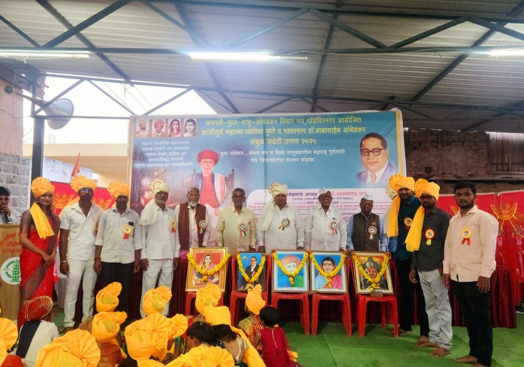 सिन्नर (प्रतिनिधी ) शिव-फुले-शाहू-आंबेडकर विचारमंच धोंडवीर नगर* आयोजित..क्रांतीसुर्य महात्मा ज्योतिबा फुले व भारतरत्न डॉक्टर बाबासाहेब आंबेडकर संयुक्त जयंती सोहळा एक नाविन्यपूर्ण पद्धतीने साजरा करण्यात आला..यावेळी धोंडविरनगर मध्ये विविध कार्यक्रमांचे आयोजन करण्यात आले होते 11 एप्रिल रोजी सकाळी नऊ वाजता फुले स्मारकाला युवा नेते उदय भाऊ सांगळे यांचे उपस्थितीत पुष्पहार अर्पण करून जल्लोषपूर्ण वातावरणात स्वागत करण्यात आले त्याचप्रमाणे सायंकाळी सहा वाजेपासून ढोल पथकाच्या गजरात व शालेय विद्यार्थी युवा युवती यांच्या विविध भारतीय संस्कृतीच्या पेहराव /महामानवांचे वेशभूषा मध्ये मिरवणूक काढण्यात येऊन फुलेंना व आंबेडकरांना अभिवादन करण्यात आले