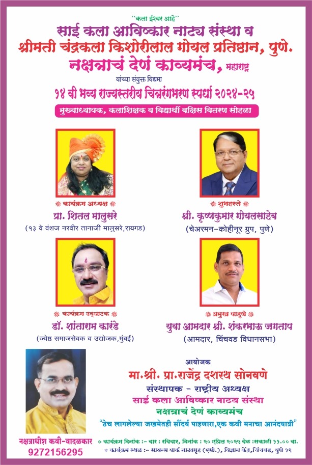 पुणे (प्रतिनिधी )१४ वी राज्यस्तरीय चित्र रंगभरण स्पर्धेत बारा हजार विद्यार्थ्यांनी सहभाग नोंदवला-*साई कला आविष्कार नाट्य संस्था , भोसरी व श्रीमती चंद्रकला किशोरील गोयल , प्रतिष्ठान,पुणे यांच्या स्मृती प्रित्यर्थ दरवर्षी एका थोर व्यक्तीच्या कार्याचा परिचय विद्यार्थी वर्गात व्हावा. म्हणून ही स्पर्धा राबविण्यात येते .या चौदाव्या वर्षी राजमाता जिजाऊ हा विषय विद्यार्थ्यांना देण्यात आला या स्पर्धेला संपूर्ण महाराष्ट्रातून बारा हजार विद्यार्थ्यांनी सहभाग नोंदवला .सहभागाबद्दल प्रत्येक सहभागी ला संस्थेच्या वतीने फोर कलर सन्मानपत्र देण्यात आले आहे.तसेच विजेत्यांना बक्षीस गोल्डन मेडल, सन्मानपत्र देण्याचा कार्यक्रम यावेळी सायन्स पार्क चिंचवड पुणे १९ येथे २०एप्रिल २०२५ला सकाळी- ११ वाजता संपणार आहे. यावेळेस शाळेचे मुख्याध्यापक व कलाशिक्षक यांना सुद्धा सन्मानित स्मृतिचिन्ह देऊन करण्यात येणार आहे. या कार्यक्रमाचे कवी साहित्यिक समाजसेवक डॉ. शांताराम कारंडे, मुंबई तसेच कार्यक्रमाच्या अध्यक्षा तानाजी मालुसरे यांच्या तेराव्या वंशज प्रा. शितल मालुसरे रायगड तसेच या कार्यक्रमाचे प्रमुख अतिथी म्हणून चिंचवड विधानसभा चे युवा आमदार शंकरभाऊ जगताप यावेळी उपस्थित राहणार आहे. समाजभूषण पुरस्कार, नक्षत्र गौरव पुरस्कार, राज्यस्तरीय बालकलाकार पुरस्कार, राज्यस्तरीय उत्कृष्ट सहभाग दौलत पुरस्कार तसेच आदर्श राज्यस्तरीय आदर्श शिक्षक पुरस्कार आणि काव्यसंग्रह प्रकाशन सोहळ्याचे आयोजन करण्यात आले आहे. हा कार्यक्रम सर्वांना विनामूल्य आहे.यावेळी सहभागी विद्यार्थ्यांना सायन्स पार्क येथील तारांगण, आकाशगंगा,थ्रीडी शो आणि विज्ञान केंद्राची भेट घडून आणण्याचे प्रयोजन करण्यात आले आहे. या कार्यक्रमाचे आयोजन आणि संयोजन राष्ट्रीय अध्यक्ष प्रा.राजेंद्र सोनवणे यांनी सुनियोजित केल्याचे संस्थेच्या वतीने कळविण्यात आले आहे. कार्यक्रम स्थळ- सायन्स पार्क नाट्यगृह पुणे मुंबई हायवे शेजारी, चिंचवड ,पुणे १९ या ठिकाणी सकाळी ११ वाजता हा सोहळा संपन्न होणार आहे. या कार्यक्रमास अनेक मान्यवर उपस्थित राहणार आहेत.