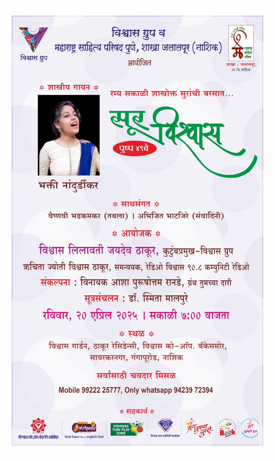 .नाशिक (प्रतिनिधी) : नव्या पिढीतील कलाकारांच्या अविष्काराला हक्काचे व्यासपीठ देण्यासाठी ‘सूर विश्वास’ या अनोख्या मैफलीचे आयोजन करण्यात आले आहे. *रविवार.20 एप्रिल2025* रोजी सकाळी 7:00 वाजता भक्ती नांदुर्डीकर यांचे शास्त्रीय गायन होणार आहे. वैष्णवी भडकमकर , (तबला), अभिजीत भटजिरे (संवादिनी) यांची त्यांना साथसंगत लाभणार आहे. तर कार्यक्रमाचे सूत्रसंचलन डॉ.स्मिता मालपुरे या करणार आहेत.