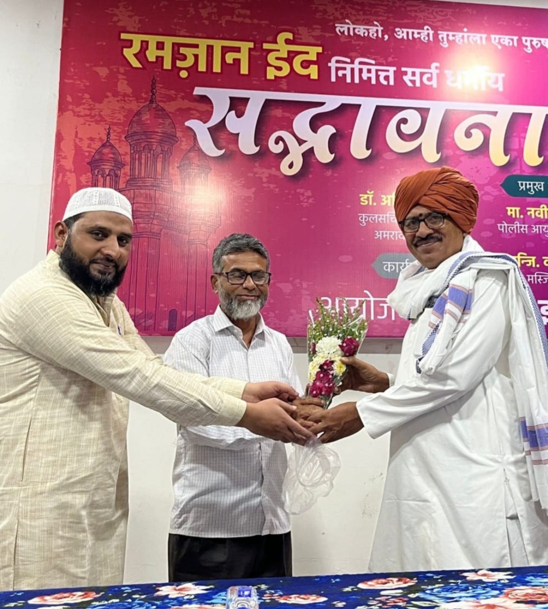 अमरावती (प्रतिनिधी) : मस्जिदीत जाताना कीर्तनकारांना आणि मंदिरात जाताना मौलानांना भिती वाटू नये. मशिदीत संत साहित्यावर कीर्तन व्हावे आणि मंदिरात कुराणावर तकरिर व्हावी. (मशिदीत मौलाना मार्गदर्शन करतात त्याला तकरिर म्हणतात). त्यातून हिंदू-मुस्लीम यांच्यात एकमेकांच्या धर्माबद्दल असणारे गैरसमज दूर होतील आणि सामाजिक सद्भावनेचा मार्ग प्रशस्त होईल, असे मत ह.भ.प. शामसुंदर महाराज सोन्नर यांनी अमरावती येथील मशिदीत प्रवचन करताना व्यक्त केले.अमरावती येथील मस्जिद तौहीद येथे जमाते इस्लाम ए हिंदच्या वतीने सामाजिक सद्भावना संमेलन आयोजित केले होते. त्यात शामसुंदर महाराज सोन्नर यांचे प्रवचन झाले. यावेळी मस्जिदचे इमाम हाफ़िज़ अब्दुल क़ादिर अंसारी यांच्यासह रफ़ीक़ अहमद खान, अज़मत उल्लाह खान, जावेद उल्लाह खान, प्रा. डाॅ. कल्याणकर, आशिष कडू, श्रीकांत बाबूळकर, प्रवीण सदार, खलील, रफिक खान, प्रदीप पाटील आदी मान्यवर उपस्थित होते. यावेळी बोलताना शामसुंदर महाराज सोन्नर पुढे म्हणाले की, धर्माची निर्मिती मानवी जीवनाला आचारसंहिता असावी म्हणून झाली. माणसाचे जगणे सुसह्य व्हावी ही त्या मागची भूमिका असावी. मात्र आज धर्मा धर्मात संघर्ष निर्माण होत आहेत. ज्यातून समाज एक संघ राहण्या ऐवजी दुभंगला जात आहेत. काही लोक आपल्या राजकीय स्वार्थासाठी धार्मिक तेढ वाढविण्यासाठी प्रयत्न करीत आहेत, अशा वळी हिंदू आणि मुस्लिम धर्मातील जाणत्या लोकांनी एकत्र येऊन सामाजिक सद्भावना वाढविण्यासाठी प्रयत्न केले पाहिजेत. जमाते इस्लाम ए हिंदच्या वतीने आयोजित केले जाणारे सद्भावना संमेलन ही दरी कमी करतील, असा विश्वास शामसुंदर महाराज सोन्नर यांनी व्यक्त केला.यावेळी समारोप करताना मस्जिदचे इमाम हाफिज अब्दुल कादीर अन्सारी म्हणाले की, इस्लामबाबत सध्या जाणीवपूर्वक गैरसमज पसरविले जात आहेत. कुराणमध्येही आमन शांतीचाच संदेश दिलेला. हा शांतीचा संदेश लोकांपर्यंत पोहचला तर दोन्ही धर्मात असलेले गैरसमज दूर होतील, त्यासाठी आपण मिळून प्रयत्न करूया, असे आवाहन त्यांनी केले..