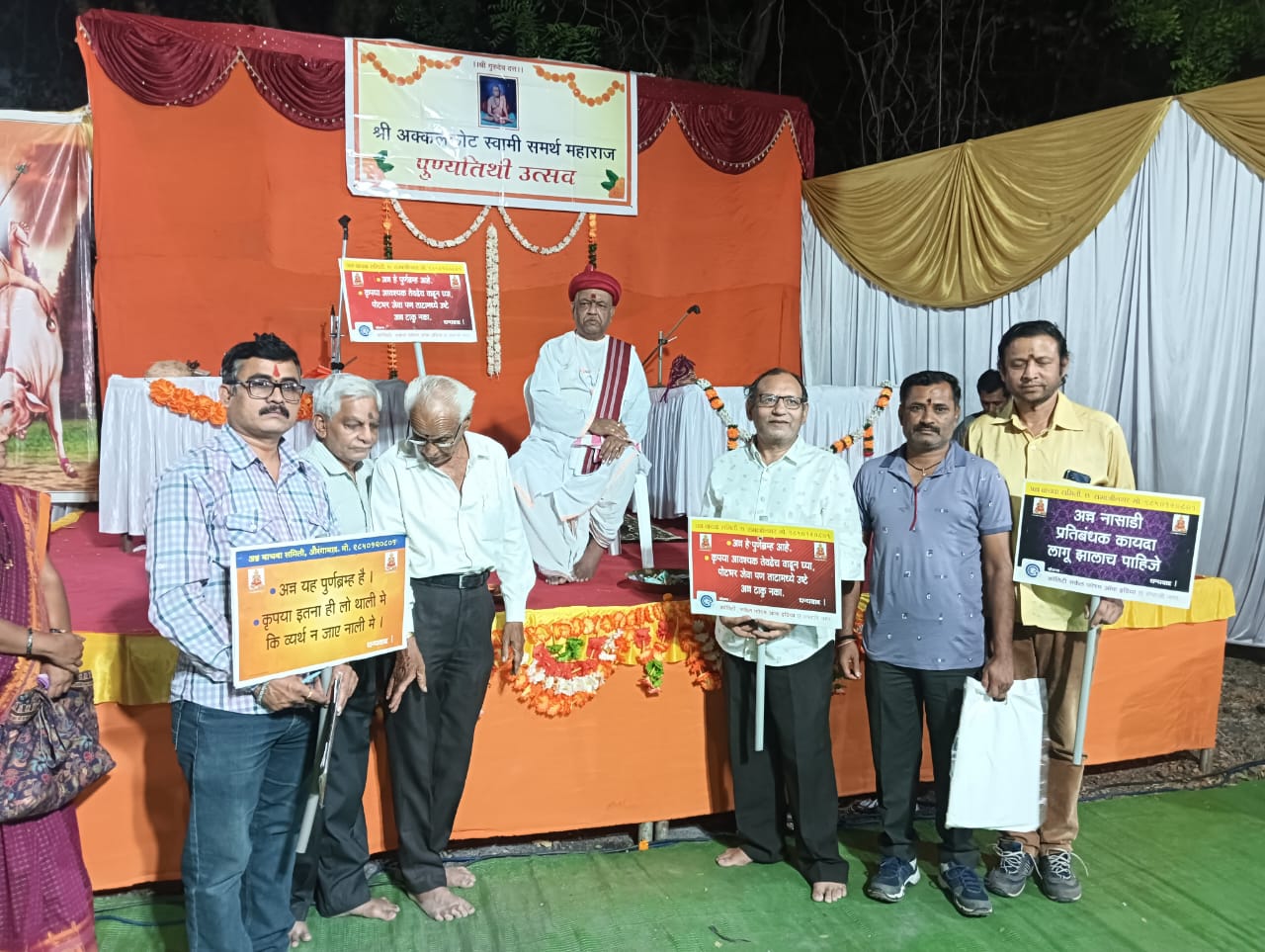 उल्का नगरी ( प्रतिनिधी ) दिनांक 27 एप्रिलला स्वामी समर्थ महाराज यांची पुण्यतिथी निमित्ताने उल्का नगरी येथे किर्तन कार्यक्रम झाला. तेथील महाप्रसाद भोजनाच्या वेळी अन्न वाचवा समिती तर्फे अन्न नासाडी बद्दल जागृती अभियान करण्यात आले. कार्यक्रमास आलेल्या सर्व भक्तांनी अन्न वाचवा समिती च्या अभियाना स योग्य प्रतिसाद देऊन जवळपास 90 टक्के लोक स्वच्छ ताट जेवले . तसेच अन्न नासाडी प्रतिबंधक कायदा लागू व्हावा म्हणून किर्तनकार महाराज सह 400 लोकांनी निवेदनावर सह्या केल्या. यावेळी पण समितीचे आनंद मोटाळे चंद्रकांत वाजपेयी दिलीप आसबे नंदकुमार कुलकर्णी नागेश गवळी आनंद लोणकर यांनी अभियान राबवले