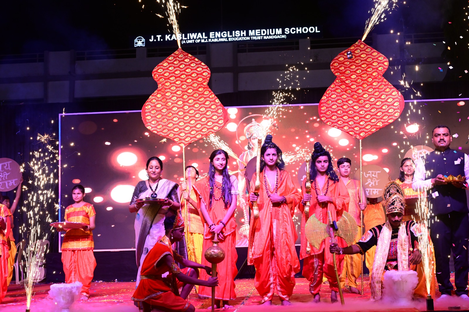 तसेच सदर कार्यक्रम प्रसंगी नांदगाव शहरातील शैक्षणिक, राजकीय, सामाजिक, आर्थिक क्षेत्रातील मान्यवर उपस्थित होते. श्री एम. जे. के एज्युकेशन ट्रस्टचे संस्थापक, अध्यक्ष श्री मा. सुनीलकुमार कासलीवाल तसेच संस्थेचे सर्व पदाधिकारी, प्रमुख पाहुणे व उपस्थित मान्यवरांच्या हस्ते भगवान महावीर तसेच सरस्वती प्रतिमा पूजन व दीप प्रज्वलन करून कार्यक्रमाचे उद्घाटन करण्यात आले. सदर कार्यक्रमाचे प्रास्ताविक शाळेचे प्राचार्य श्री. मनी चावला यांनी केले.