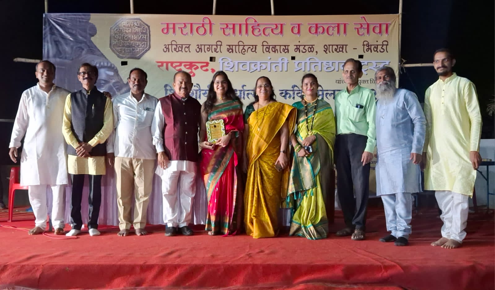 भिवंडी (गुरुदत्त वाकदेकर) :मराठ्यांच्या इतिहासातील अजरामर शौर्यगाथांचा जयघोष करणारे “शिवशौर्य स्पर्धात्मक कविसंमेलन २०२५” भिवंडीतील छत्रपती श्री शिवाजी महाराज मंदिर प्रांगणात अत्यंत उत्साहात आणि जल्लोषात पार पडले. मराठी साहित्य व कला सेवा, राष्ट्रकुट, अखिल आगरी साहित्य विकास मंडळ (शाखा – भिवंडी) आणि शिवक्रांती प्रतिष्ठान ट्रस्ट यांच्या संयुक्त विद्यमाने १ मे रोजी या भव्य कार्यक्रमाचे आयोजन करण्यात आले होते.या स्पर्धात्मक कविसंमेलनात महाराष्ट्राच्या कानाकोपर्यातून सारस्वतांनी छत्रपती शिवाजी महाराज यांच्या जीवन, शौर्य, मर्दुमकी, सामाजिक आणि राजकीय कार्यावर आधारित वैविध्यपूर्ण कविता सादर केल्या. उपस्थित रसिकांनी त्या सादरीकरणांना भरभरून दाद दिली.या कार्यक्रमात गुजरातमधील बडोदा येथून आलेल्या केतकी कुलकर्णी यांनी सुनिल पाटील यांची “शिवबा” ही ओजस्वी कविता सादर करत विशेष लक्ष वेधून घेतले. त्यांच्या सादरीकरणाबद्दल त्यांना शाल, सन्मानचिन्ह आणि सस्नेह भेट देऊन मान्यवरांच्या हस्ते गौरविण्यात आले.तसेच सर्व सहभागी स्पर्धकांनाही सादरीकरणानंतर मान्यवरांच्या हस्ते सस्नेह भेटवस्तू देऊन सन्मानित करण्यात आले.