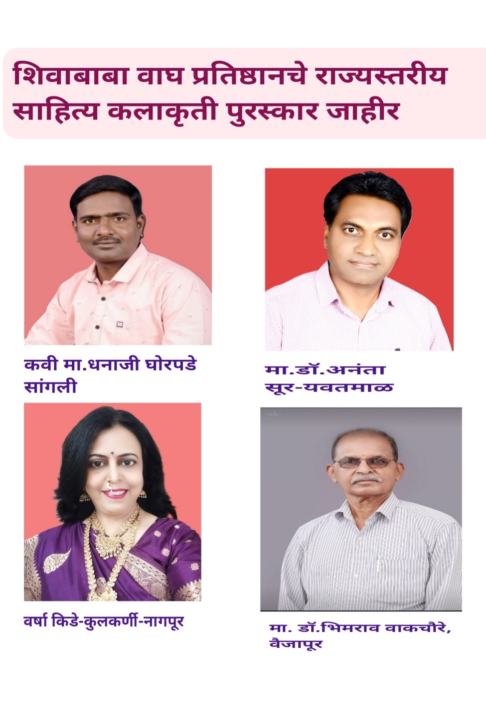 येवला प्रतिनिधी : तालुक्यातील पिंपळगाव जलाल येथी शिवाबाबा वाघ प्रतिष्ठान आयोजित शहादू शिवाजी वाघ स्मृती चौथ्या राज्यस्तरीय साहित्य कलाकृती पुरस्काराचे निकाल दि. ०१ मे २०२५ रोजी कामगार दिनाच्या दिवशी जाहीर झाले असल्याचे प्रतिष्ठानचे अध्यक्ष संजय वाघ यांनी कळविले आहे.पिंपळगाव जलाल येथील शिवाबाबा वाघ प्रतिष्ठान आयोजित शहादू शिवाजी वाघ यांच्या स्मृतीदिनानिमित्त चौथ्या राज्यस्तरीय साहित्य कलाकृती पुरस्काराचे नियोजन करण्यात आले होते. महाराष्ट्रातून कविता संग्रह- ७८ , कथा संग्रह-२२, कादंबरी -१६ आणि ललित लेखसंग्रह- २२ व इतर ५ अशा एकूण १४३ विविध प्रकारच्या साहित्य कलाकृती पुरस्कारासाठी प्राप्त झाल्या होत्या. या कलाकृतीतून प्रत्येक साहित्य प्रकारातील एक कलाकृतीला प्रथम क्रमांकाचा पुरस्कार जाहीर झाला आहे. निकाल पुढीलप्रमाणे –