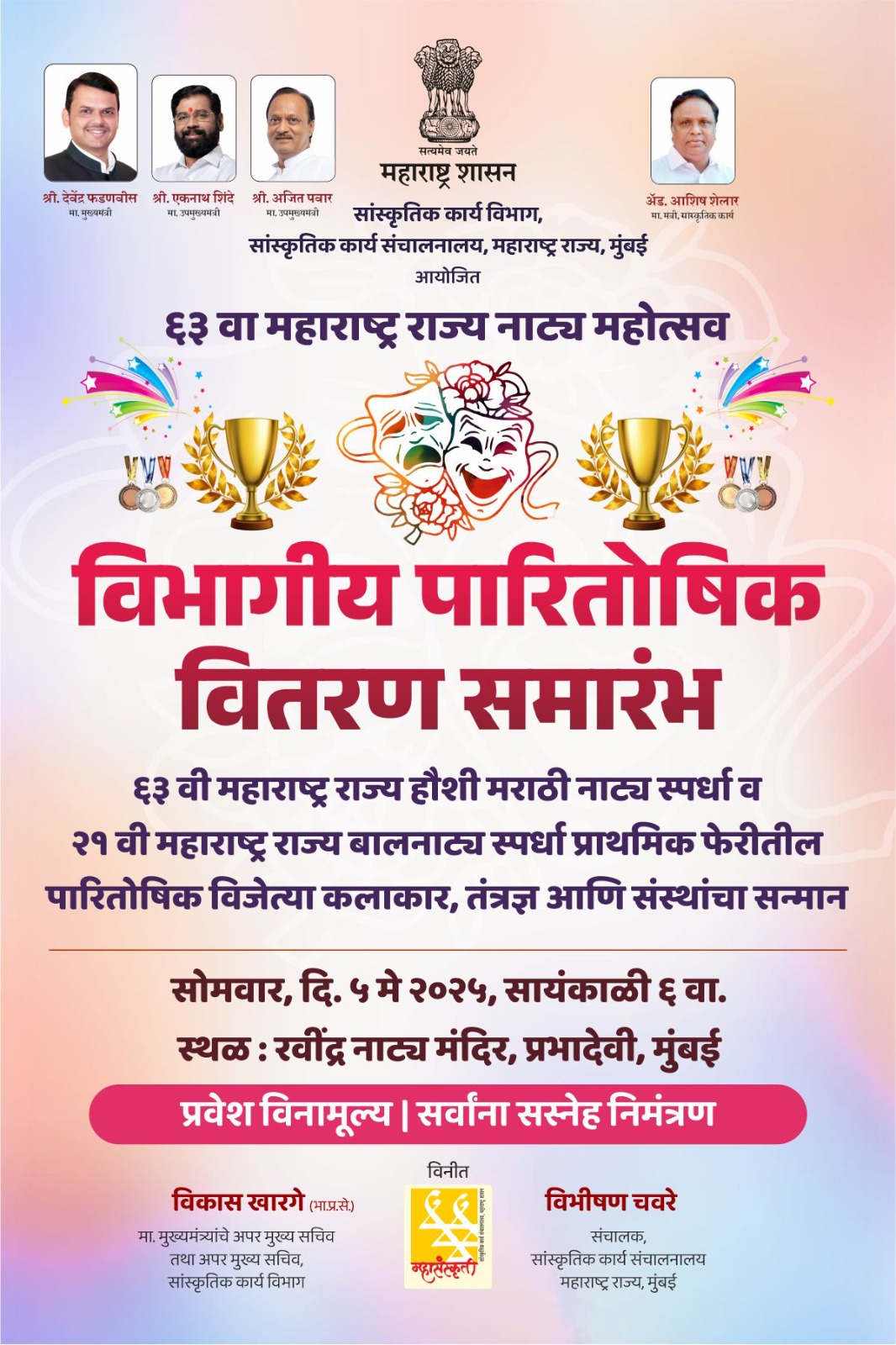 मुंबई (गुरुदत्त वाकदेकर) : महाराष्ट्र शासनाच्या सांस्कृतिक कार्य विभागातर्फे आयोजित ६३ व्या महाराष्ट्र राज्य हौशी मराठी नाट्य स्पर्धा आणि २१ व्या राज्य बालनाट्य स्पर्धेच्या प्राथमिक फेरीतील विजेत्या कलाकार, तंत्रज्ञ व नाट्य संस्थांचा विभागीय पारितोषिक वितरण सोहळा सोमवार, ५ मे २०२५ रोजी सायंकाळी ६ वाजता आयोजित करण्यात आला आहे. हा भव्य सोहळा मुंबईतील रवींद्र नाट्यमंदिर, प्रभादेवी येथे पार पडणार असून सर्व रसिकांसाठी प्रवेश विनामूल्य आहे.या कार्यक्रमात प्राथमिक फेरीत उत्कृष्ट कामगिरी करणाऱ्या नाट्य कलाकारांचा, तंत्रज्ञांचा तसेच नाट्य संस्थांचा गौरव करण्यात येणार आहे. नाट्य क्षेत्रातील नवोदित आणि हौशी कलाकारांना व्यासपीठ मिळवून देण्यासाठी तसेच त्यांच्या प्रतिभेला प्रोत्साहन देण्यासाठी हा उपक्रम महत्त्वपूर्ण ठरत आहे.राज्याचे सांस्कृतिक कार्य मंत्री ऍड. आशिष शेलार आणि मुख्यमंत्र्यांचे अपर मुख्य सचिव विकास खारगे यांच्या मार्गदर्शनाखाली या कार्यक्रमाचे आयोजन करण्यात आले आहे. हा सोहळा सांस्कृतिक कार्य संचालनालय, महाराष्ट्र राज्य, मुंबई यांच्या वतीने आयोजित करण्यात आला असून सर्व रसिकांनी मोठ्या संख्येने उपस्थित राहावे, असे आवाहन सांस्कृतिक कार्य संचालक विभीषण चवरे यांनी केले आहे.