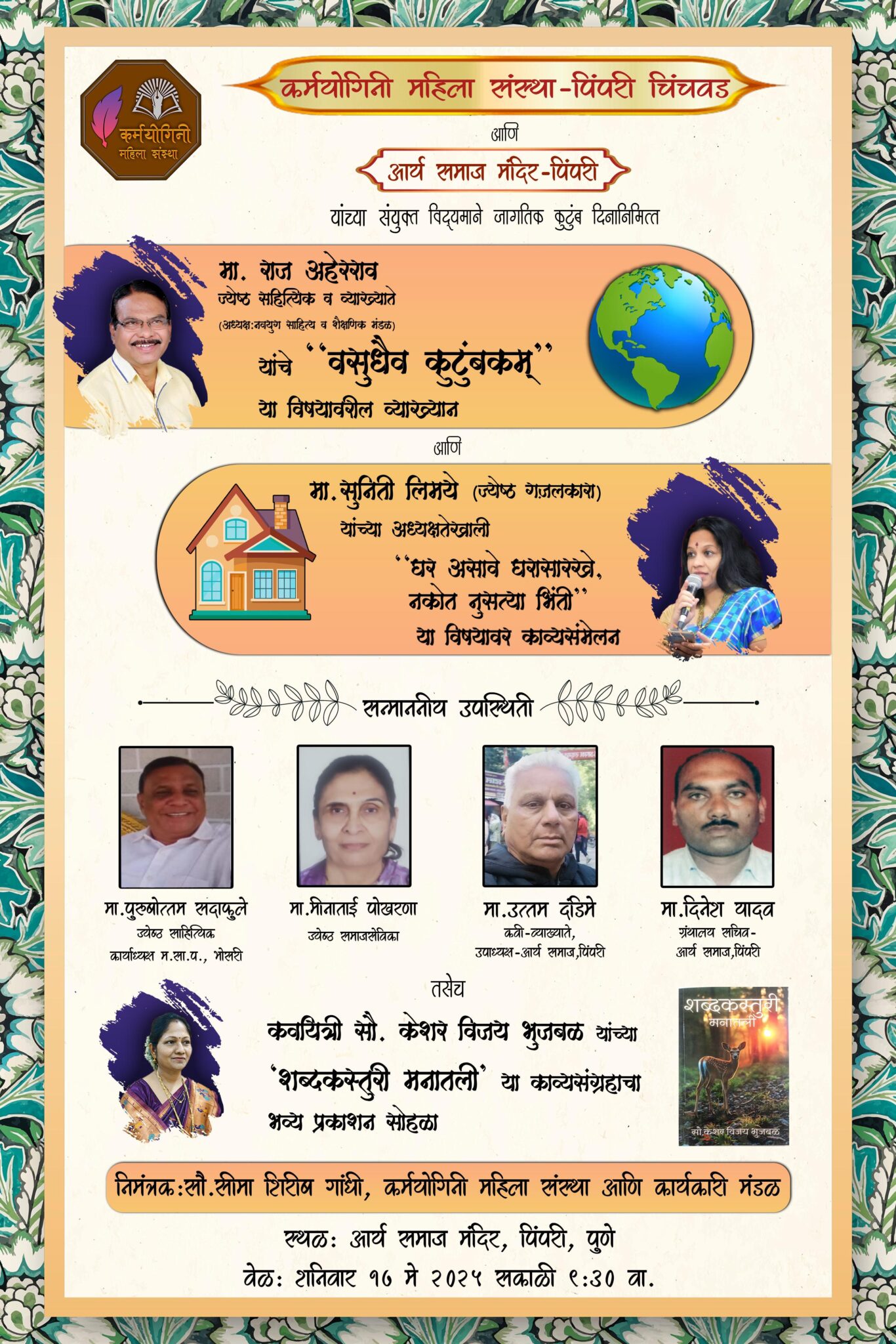 पिंपरी, पुणे (गुरुदत्त वाकदेकर) : कर्मयोगिनी महिला संस्था – पिंपरी चिंचवड आणि आर्य समाज मंदिर – पिंपरी यांच्या संयुक्त विद्यमाने जागतिक कुटुंब दिनानिमित्त एक प्रेरणादायी व बहुआयामी साहित्यिक कार्यक्रमाचे आयोजन करण्यात आले आहे.या विशेष कार्यक्रमात मा. राज अहेरराव (ज्येष्ठ साहित्यिक व व्याख्याते, अध्यक्ष – नवयुग साहित्य व शैक्षणिक मंडळ) यांचे “वसुधैव कुटुंबकम्” या विषयावर अभ्यासपूर्ण व उद्बोधक व्याख्यान होणार आहे. त्यानंतर मा. सुनिती लिमये (ज्येष्ठ गझलकार) यांच्या अध्यक्षतेखाली “घर असावे घरासारखे, नकोत नुसत्या भिंती” या भावस्पर्शी विषयावर काव्यसंमेलन आयोजित करण्यात आले आहे.या कार्यक्रमाला मा. पुरुषोत्तम सदाफुले (ज्येष्ठ साहित्यिक, कार्याध्यक्ष – म.सा.प., भोसरी), मा. मीनाताई पोखरणा (ज्येष्ठ समाजसेविका), मा. उत्तम दंडिमे (कवी, व्याख्याते, उपाध्यक्ष – आर्य समाज, पिंपरी) आणि मा. दिनेश यादव (ग्रंथपाल – आर्य समाज, पिंपरी) यांची सन्माननीय उपस्थिती लाभणार आहे.कार्यक्रमाचे विशेष आकर्षण ठरणार आहे कवयित्री केशर विजय भुजबळ यांच्या “शब्दकस्तुरी मनातली” या काव्यसंग्रहाचा भव्य प्रकाशन सोहळा. रसिकांसाठी हा एक संस्मरणीय आणि साहित्यप्रेम जागवणारा क्षण ठरणार आहे.कार्यक्रमाच्या निमंत्रक आहेत सीमा शिरीष गांधी (कर्मयोगिनी महिला संस्था व कार्यकारी मंडळ). तर कार्यक्रमाचे ठिकाण आहे आर्य समाज मंदिर, पिंपरी, पुणे आणि वेळ आहे शनिवार, १७ मे २०२५ रोजी सकाळी ९:३० वाजता सुरू होणार आहे.साहित्य, संस्कृती आणि कुटुंबमूल्यांचा संगम असलेल्या या कार्यक्रमाला उपस्थित राहून लाभ घेण्याचे आवाहन आयोजकांकडून सर्व रसिकांना करण्यात येत आहे.