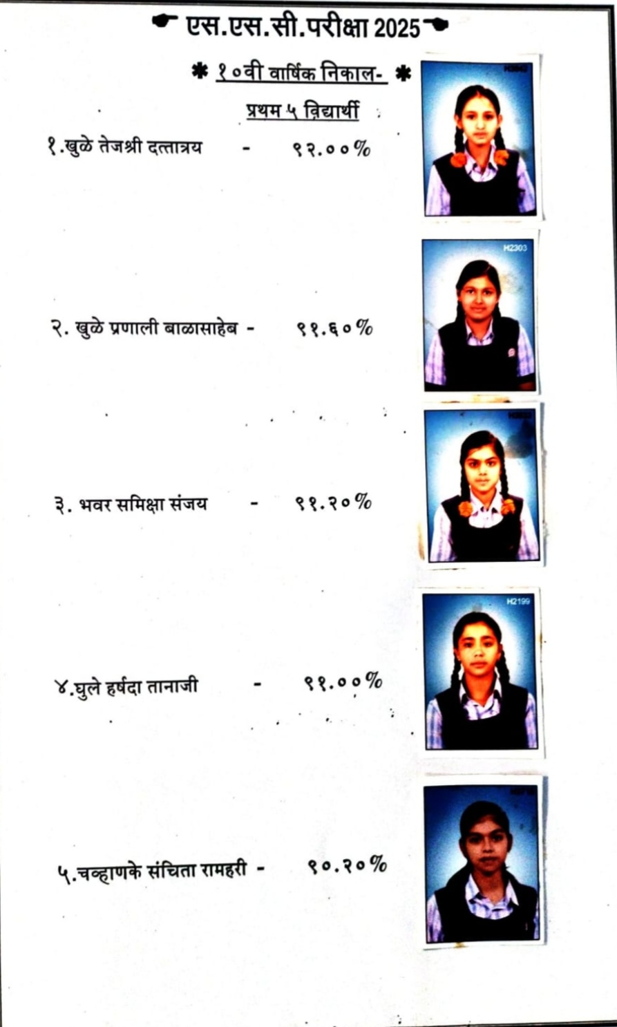 वडांगळी( प्रतिनिधी ) मराठा विद्या प्रसारक समाज संस्था संचलित न्यू इंग्लिश स्कूल व उच्च माध्यमिक विद्यालय व अभिनव बाल विकास मंदिर या विद्यालयाचा एस. एस. सी. परीक्षेचा निकाल ९७.१४ टक्के इतका लागला आहे. इयत्ता दहावी सन २०२४/२५ या सालाकरता एकूण प्रविष्ट १७५ विद्यार्थी पैकी १७० विद्यार्थी उत्तीर्ण झाले आहेत .पहिले प्रथम पाच क्रमांक पुढील प्रमाणे….१)प्रथम … खुळे तेजश्री दत्तात्रय.४६० गुण ९२.०० टक्के२) द्वितीय..खुळे प्रणाली बाळासाहेब ४५८गुण ९१.६०टक्के.३) तृतीय …भवर समीक्षा संजय ४५६ गुण ९१.२० टक्के ४) चतुर्थ…घुले हर्षदा तानाजी ४५५ गुण ९१.०० टक्के५) पाचवा.. चव्हाणके संचिता रामहरी४५१ गुण ९०.२० टक्के. या विद्यार्थ्यांना मुख्याध्यापक बाळासाहेब खैरनार, पर्यवेक्षक मच्छिंद्र धातडक, सुभाषराव ठोक इयत्ता दहावीला शिकवणारे सर्व शिक्षक यांचे मार्गदर्शन लाभले आहे.या यशाबद्दल मविप्र समाज संस्थेचे अध्यक्ष सुनीलजी ढिकले, सरचिटणीस अॅड.नितीनजी ठाकरे साहेब,सिन्नर तालुका संचालक कृष्णाजी भगत साहेब, माध्यमिक शालेय समितीचे अध्यक्ष सुदेश दादा खुळे, उच्च माध्यमिक शालेय समितीचे अध्यक्ष आर.जे. थोरात सर, अभिनव बाल विकास मंदिर शालेय समितीचे अध्यक्ष भाऊसाहेब चव्हाणके ,सरपंच नानासाहेब खुळे, युवा सभासद विक्रम माधवराव खुळे, विक्रम भास्कर खुळे सर्व शिक्षक ,संस्थेचे सर्व ज्येष्ठ सभासद पालक शिक्षक व शिक्षकेतर कर्मचारी यांचे अभिनंदन केले आहे.