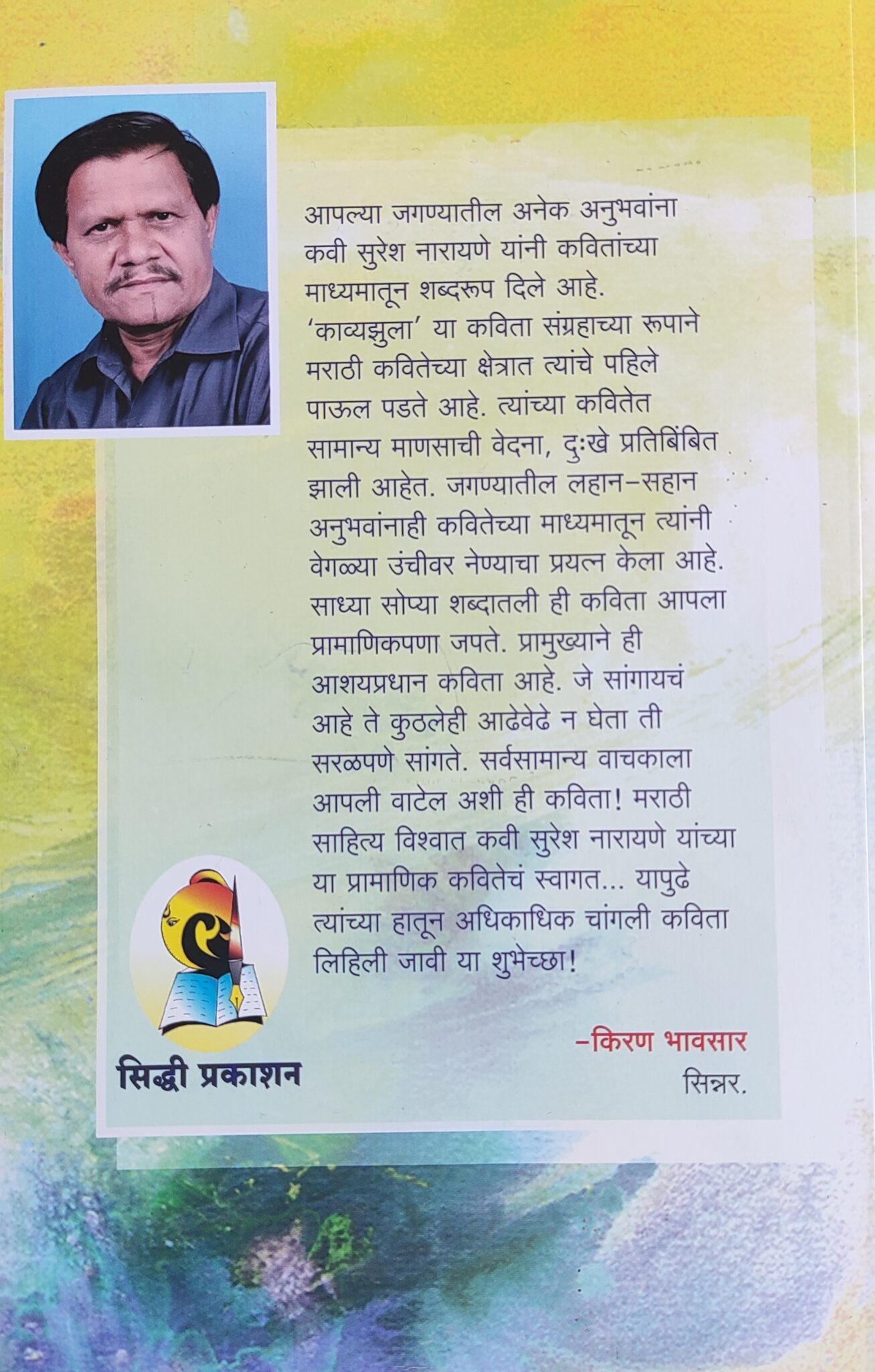 प्रशांत वाघ (पॅसिफिक टायगर)संपर्क – ७७७३९२५००० (तीन सत्ते एकोणचाळीस पंचवीस हजार)कलाकृती परिचय:कलाकृती – कविता : काव्यझुला साहित्य प्रकार – काव्यसंग्रह कवी – प्रा. सुरेश नारायणे कवीचा संपर्क क्रमांक -९९६०३ ३०४३८प्रकाशक : सिद्धी प्रकाशन- मनमाड मुखपृष्ठचित्रकार – विष्णू थोरे, चांदवड