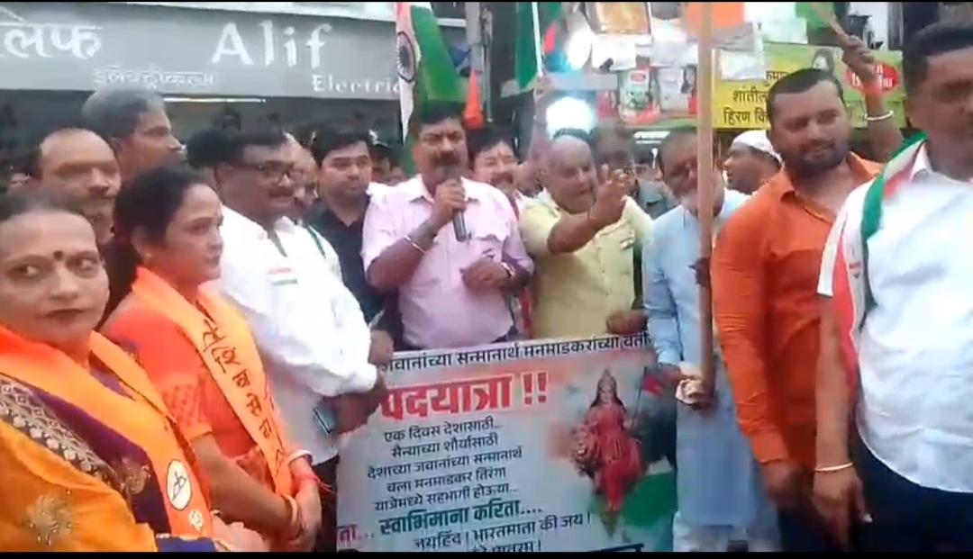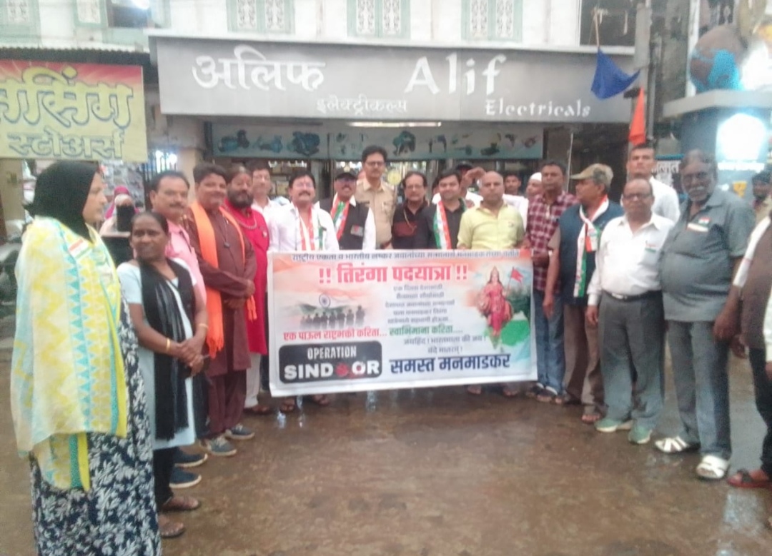 मनमाड ( प्रतिनिधी ) मनमाडकरांकडून भव्य ‘तिरंगा पदयात्रा’चे आयोजन भारतीय लष्कराच्या जवानांना मान सन्मान आणि राष्ट्रीय एकतेसाठी पुढाकारमनमाड, दि. २० मे: राष्ट्रीय एकता आणि भारतीय लष्करातील जवानांच्या सन्मानार्थ मनमाडकरांच्या वतीने आज सायंकाळी ५ वाजता भव्य ‘तिरंगा पदयात्रा’चे आयोजन करण्यात आले होते. “भारत माता की जय”, “वंदे मातरम्”च्या घोषणांनी शहराचे वातावरण देशभक्तीमय होऊन गेले .ही पदयात्रा श्री रु्द्र हनुमान मंदिर पासून सुरू झाली असून महात्मा ज्योतिबा फुले चौक, छत्रपती शिवाजी महाराज चौक, इंडियन हार्टस्पॉट, मनमाड रेल्वे स्टेशन, भारतरत्न डॉ. बाबासाहेब आंबेडकर चौक, नेहरू चौक, ते सन्मार्ग एकात्मता चौक येथे सांगता झाली