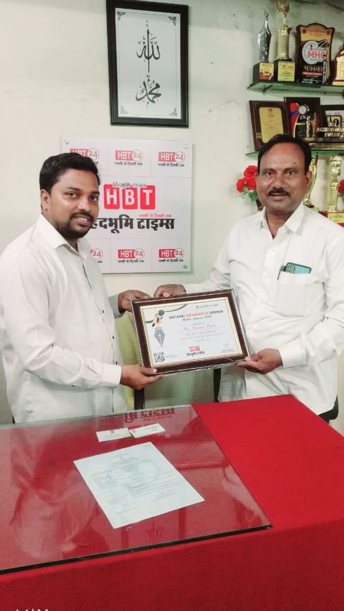 भिवंडी (गुरुदत्त वाकदेकर) : हिंदी पत्रकार दिनाचे औचित्य साधून हिंदभूमी टाइम्सचे संपादक तथा समाजसेवक यूसुफ मन्सूरी यांच्या वतीने २०२४ मध्ये विविध सामाजिक क्षेत्रांत कार्य करणाऱ्या मान्यवरांचा सत्कार भिवंडी येथील धामणकर नाका येथील सिटी सेंटर मॉलमध्ये करण्यात आला.या कार्यक्रमात ठाणे जिल्ह्यातील अग्रगण्य दैनिक स्वराज्य तोरणचे संपादक डाॅ. किशोर बळीराम पाटील यांना “राष्ट्रीय पत्रकार सन्मान रत्न पुरस्कार २०२४” प्रदान करण्यात आला. हा पुरस्कार हिंदभूमी टाइम्सचे संपादक तथा समाजसेवक यूसुफ मन्सूरी यांच्या शुभहस्ते प्रदान करण्यात आला.कार्यक्रमाचा मुख्य उद्देश म्हणजे शहरातील सामाजिक कार्य करणाऱ्या डॉक्टर, पोलीस, पत्रकार, शिक्षक, वकील व इतर मान्यवरांना सन्मानित करून त्यांच्या कार्याचा गौरव करणे, तसेच समाजात सकारात्मक कार्याची प्रेरणा प्रसारित करणे हा होता.कार्यक्रमास प्रमुख पाहुणे म्हणून भाजपा भिवंडी युवा मोर्चा अध्यक्ष राजू चौघुले, माजी नगरसेवक वसीम अंसारी, समाजसेवक अकरम मन्सूरी, पोलीस उपनिरीक्षक अनंता वाघ, वकील खदीजा खान (मुंबई उच्च न्यायालय), मुख्याध्यापिका माहेनूर खान यांची उपस्थिती लाभली होती. तसेच पत्रकार क्षेत्रातील डाॅ. किशोर बळीराम पाटील (संपादक, दै. स्वराज्य तोरण), फिरोज मेमन, अमृत शर्मा, आचार्य सुरजपाल यादव, संदीप गुप्ता, सोहेल अंसारी, सय्यद नकी हसन यांनीही आपली उपस्थिती नोंदवली.कार्यक्रमाचे आयोजन पत्रकार यूसुफ मन्सूरी यांनी केले होते, तर सूत्रसंचालन व आभार प्रदर्शन सज्जाद अख्तर यांनी केले.हा कार्यक्रम समाजासाठी प्रेरणादायी ठरला, अशी प्रतिक्रिया उपस्थित मान्यवरांनी व्यक्त केली.