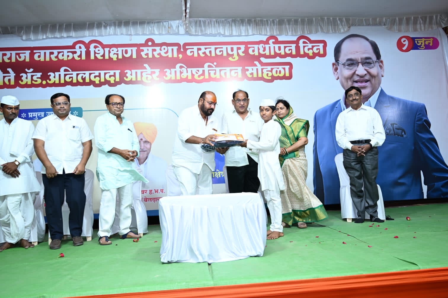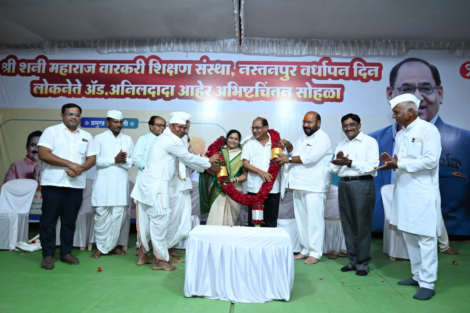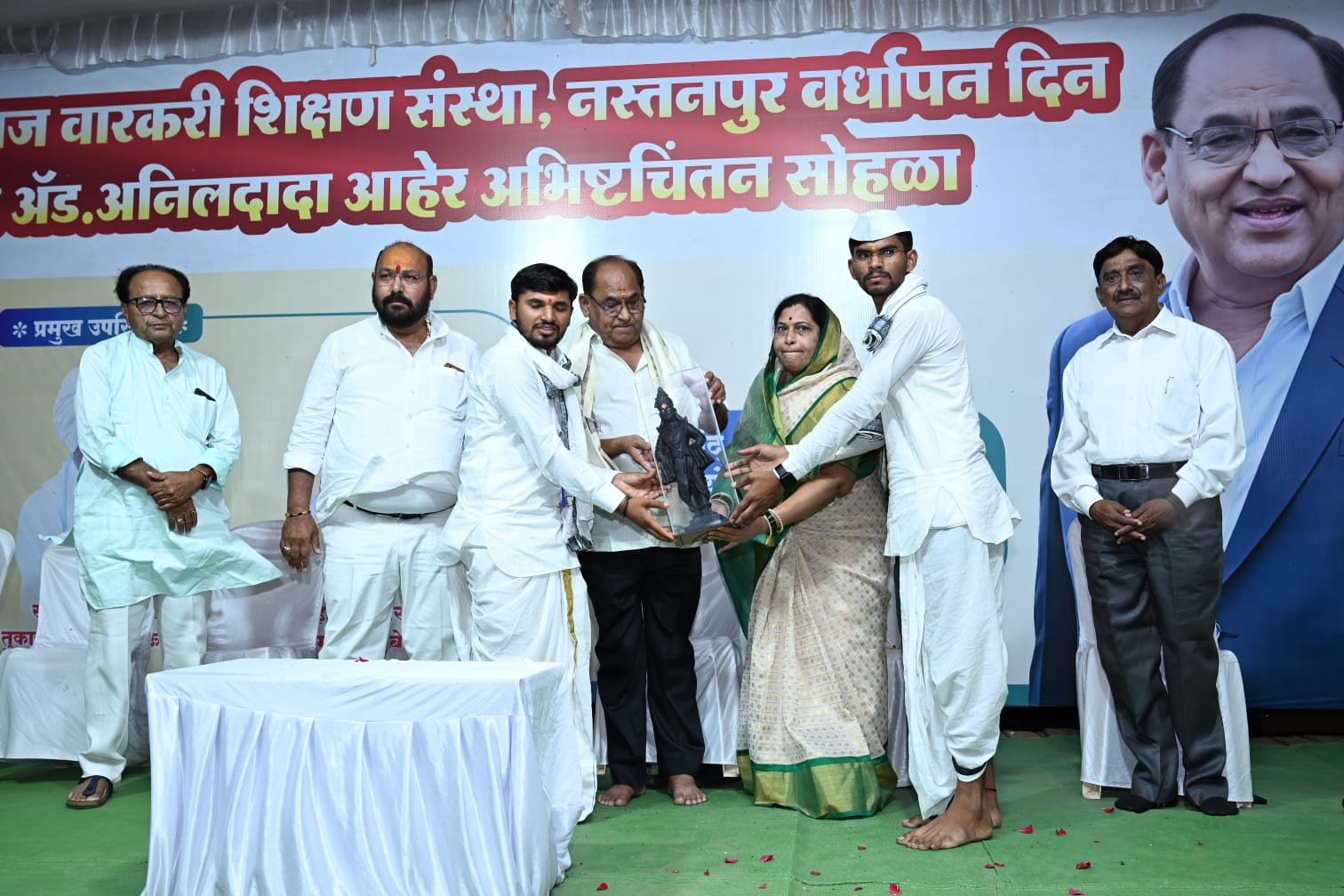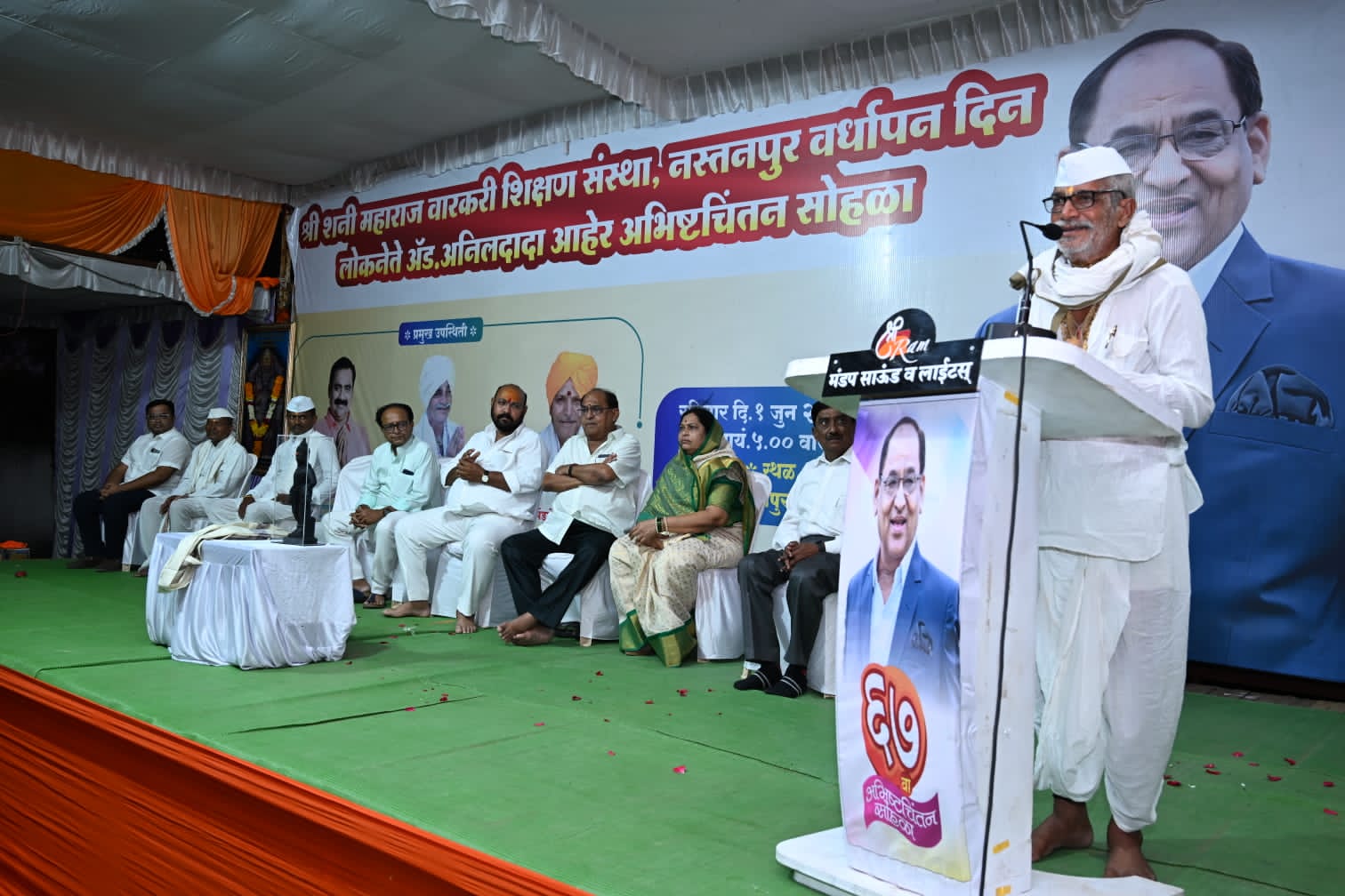 त्याचा आज पहिला वर्धापन दिन साजरा करताना वारकरी शिक्षण संस्थेतून अध्यात्मिक शिक्षण घेऊन पूर्ण झालेल्या विद्यार्थ्यांचा गौरव तसेच त्यांना पुढील शालेय शिक्षण घेण्यासाठी शैक्षणिक साहित्य बरोबर कीर्तन भजनाचे साहित्य देऊन सन्मानित करण्यात आले हा एक अनोखा उपक्रम राबवून अनिलदादांनी राजकारणी पुढारी फक्त साधू संतांचा उपयोग राजकारणा पुरताच करत नाहीत तर त्यांच्या प्रेरणेतून अध्यात्मिक गुणवानही तयार करू शकतात हे “आधी केले मग सांगितले” या उक्तीप्रमाणे करून दाखविले आहे असे गौरव उद्गार माजी आमदार संजुभाऊ पवार यांनी काढले ते नस्तनपुर येथे पार पडलेल्या शनेश्वर वारकरी शिक्षण संस्थेचा प्रथम वर्धापन दिन तसेच ॲड अनिलदादा आहेर यांच्या ६७ वा अभिष्टचिंतन सोहळ्याच्या कार्यक्रमाचे अध्यक्ष स्थानावरून बोलत होते