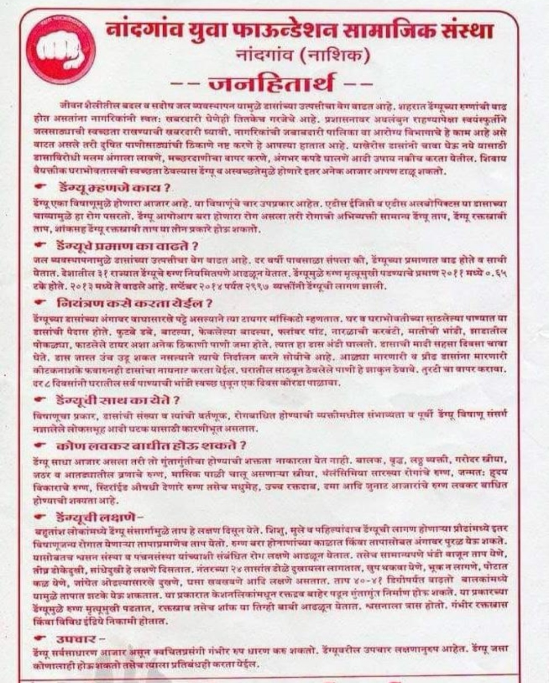 नांदगाव (प्रतिनिधी)पावसाळ्यातील अस्वच्छता आणि डासांमुळे वाढणाऱ्या आजारांचा धोका डेंगू सदृश्य आजाराने दोघांचा मृत्यू ?नांदगांव यावर्षी पावसाळा लवकर सुरू झाल्याने नांदगाव शहर आणि परिसरामध्ये ठीक ठिकाणी पाणी साचून गटारी तुंबून डास आणि मच्छर ची उत्पत्ती वाढलेली आहे त्यासोबत माशाची देखील दुर्गंधी वाढत चालली आहे सर्व बाजूने दुर्गंधी वाढ त चालल्याने डेंगूंचे रुग्ण वाढत चालल्याचे तक्रारी नागरिक करत आहे याकडे नांदगाव पालिका प्रशासनाने लक्ष घालावे अशी मागणी होत आहे नांदगाव शहरात डेंगूसदृश्य आजाराने दोघांचा मृत्यू झाल्याने आरोग्य संदर्भात गंभीर प्रश्न निर्माण झाला आहे.पावसाळा सुरु होताच शहरांमध्ये अस्वच्छतेची समस्या डोके वर काढते. रस्त्यांवर साचलेले पाणी, तुंबलेले नाले, उघड्यावर पडलेला कचरा आणि त्यातून निर्माण होणारी दुर्गंधी ही परिस्थिती नागरिकांसाठी आरोग्याच्या दृष्टीने अत्यंत धोकादायक ठरू लागली आहे.या अस्वच्छतेमुळे डासांचा मोठ्या प्रमाणावर प्रादुर्भाव वाढतो. डासांच्या वाढीस पोषक ठरणारे हे साचलेले पाणी डेंगू, चिकनगुनिया, मलेरिया यांसारख्या आजारांना कारणीभूत ठरत आहे. दरवर्षीप्रमाणे यंदाही पावसाच्या आगमनानंतर काही आठवड्यांतच विविध रुग्णालयांमध्ये डेंगू आणि सदृश्य आजारांचे रुग्ण दाखल होण्यास सुरुवात झाली आहे.शहरांमध्ये अनेक भागांत गटारांची सफाई न झाल्याने पावसाचे पाणी तुंबते. साचलेल्या पाण्यात अळ्या वाढतात आणि काही दिवसांतच डासांची संख्या झपाट्याने वाढते. या डासांमुळे अनेक कुटुंबांना जीवघेण्या आजारांचा सामना करावा लागत आहे. त्यातच दुर्गंधीमुळे वातावरण असह्य बनते. नागरिकांना घरात राहणेही कठीण होते.स्थानिक स्वराज्य संस्था, पालिका आणि आरोग्य विभाग यांनी वेळेवर स्वच्छता मोहीम, नाल्यांची सफाई, कीटकनाशक फवारणी यासारखी उपाययोजना न केल्याने ही परिस्थिती अधिक गंभीर होत आहे. लोकांनीही आपल्या परिसरात स्वच्छता ठेवणे, पाणी साचू न देणे, डास प्रतिबंधक उपाय करणे गरजेचे आहे.नागरिकांच्या आरोग्याची जबाबदारी ही केवळ प्रशासनाची नसून सर्वांचीच आहे. शहर स्वच्छ ठेवले तरच आजारांपासून सुरक्षित राहता येईल. अन्यथा पावसाळा हा सौंदर्याचा ऋतू नसून त्रासदायक काळ ठरू शकतो.दरम्यान नांदगाव शहरातील धनगर वाड्यातील रहिवासी असलेले कृष्णा तानाजी चव्हाण हे शेतकरी दिनांक 6 / 6/25 रोजी डेंगू आजारांनी निधन झाल्याचे त्यांचे कुटुंबीयांकून सांगण्यात येते. नांदगाव शहरांमध्ये डेंगूंची उत्पत्ती आणि रुग्णांची संख्या वाढत आहे मे महिन्यात पाऊस पडला स्वच्छतेचे कमांड दिलेले आहे हे फक्त रस्त्यावरच साफसफाई केली जाते परंतु गल्लीबोळात फारशी सफाई होताना दिसत ना