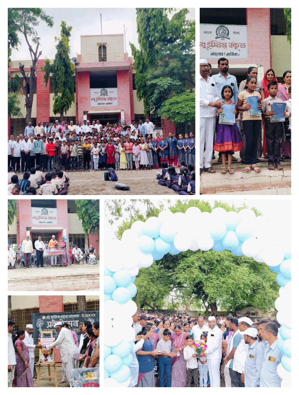 नांदगाव (प्रतिनिधी ) मविप्र संचलित न्यू इंग्लिश स्कूल नांदगाव विद्यालयात प्रवेशोत्सव प्रसंगी नवोदितांचे औक्षण करून, पुष्पगुच्छ देऊन व ढोल ताशांच्या गजरात स्वागत करण्यात आले . या कार्यक्रमाच्या अध्यक्षस्थानी शालेय समितीचे अध्यक्ष श्री विजय काकळीज सर होते. प्रास्ताविक विद्यालयाचा मुख्याध्यापिका श्रीमती काळे मॅडम यांनी केले. त्यांनी मंचावर उपस्थित असणाऱ्या सर्व मान्यवरांचे शब्द सुमनांनी स्वागत केले . शिक्षण हा जीवनाचा एक अविभाज्य घटक आहे असे त्यांनी आपल्या प्रास्ताविकातून स्पष्ट केले.