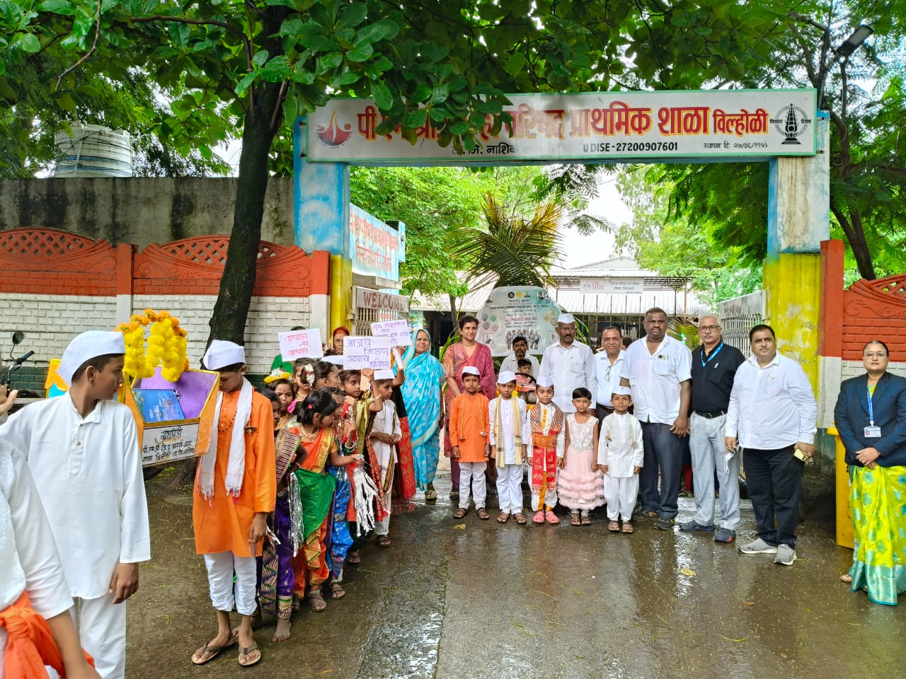 नाशिक: ( वार्ताहर )आज जिल्हा परिषद शाळा विल्होळी येथे शाळा प्रवेशोत्सव जल्लोषात साजरा करण्यात आला. सर्व प्रथम इयत्ता पहिलीत दाखल नवागतांचे स्वागत करण्यात येऊन मिनी ट्रॅक्टर मधून सर्व मुलांची मिरवणूक काढण्यासाठी गाडी सजविण्यात आली व गावातून मिरवणूक काढण्यात आली. नवागतांचे पहिले पाऊल घेण्यात येऊन त्यांचे औक्षणही करण्यात आले. यानंतर इयत्ता 1 ते 7 च्या सर्व विद्यार्थ्यांना पाठ्यपुस्तकांचे व मोफत गणवेशाचे वाटप करण्यात आले. खासदार राजाभाऊ वाजेच्या निधीतून ऑनलाईन दाखले सॉफ्टवेअर चे उदघाटन करण्यात आले तसेच दुपारच्या जेवणात विद्यार्थ्यांना गोड शिरा तसेच मसाला भात चे जेवण देण्यात आले. याप्रसंगी शाळा व्यवस्थापन समिती अध्यक्ष,संजय गायकवाड आणि सर्व सदस्य,गावचे सरपंच सौ.जानकाबाई चव्हाण भास्कर भाऊ थोरात उपसरपंच ग्रामपंचायत सदस्य, माजी सभापती रत्नाकर चुंभळे गटविकास अधिकारी सोनिया नाकोडे मॅडम, गटशिक्षणाधिकारी मंदाकिनी देवकर, विस्तार अधिकारी मोहन रणदिवे सुनील दराडे, उमरे साहेब ग्रामविस्तार अधिकारी जाधव ग्रामपंचायत सदस्या श्रीमती कदम ताई रुपवते ताई दैनिक पुढारीचे वार्ताहर बाळासाहेब वाजे उपस्थित होते. कार्यक्रम यशस्वी करण्यांसाठी मुख्याध्यापक नितीन पवार सतीश लाड रंजन भावसार सुवर्णा पवार आशालता फलके शैलजा सामुद्रे, संगिता नागपुरे शीतल शिंदे आशा चौधरी रुपाली शिंदे पौर्णिमा थोरात वारुंगसे मॅडम आणि पालक वर्ग यांनी प्रयत्न केले.
