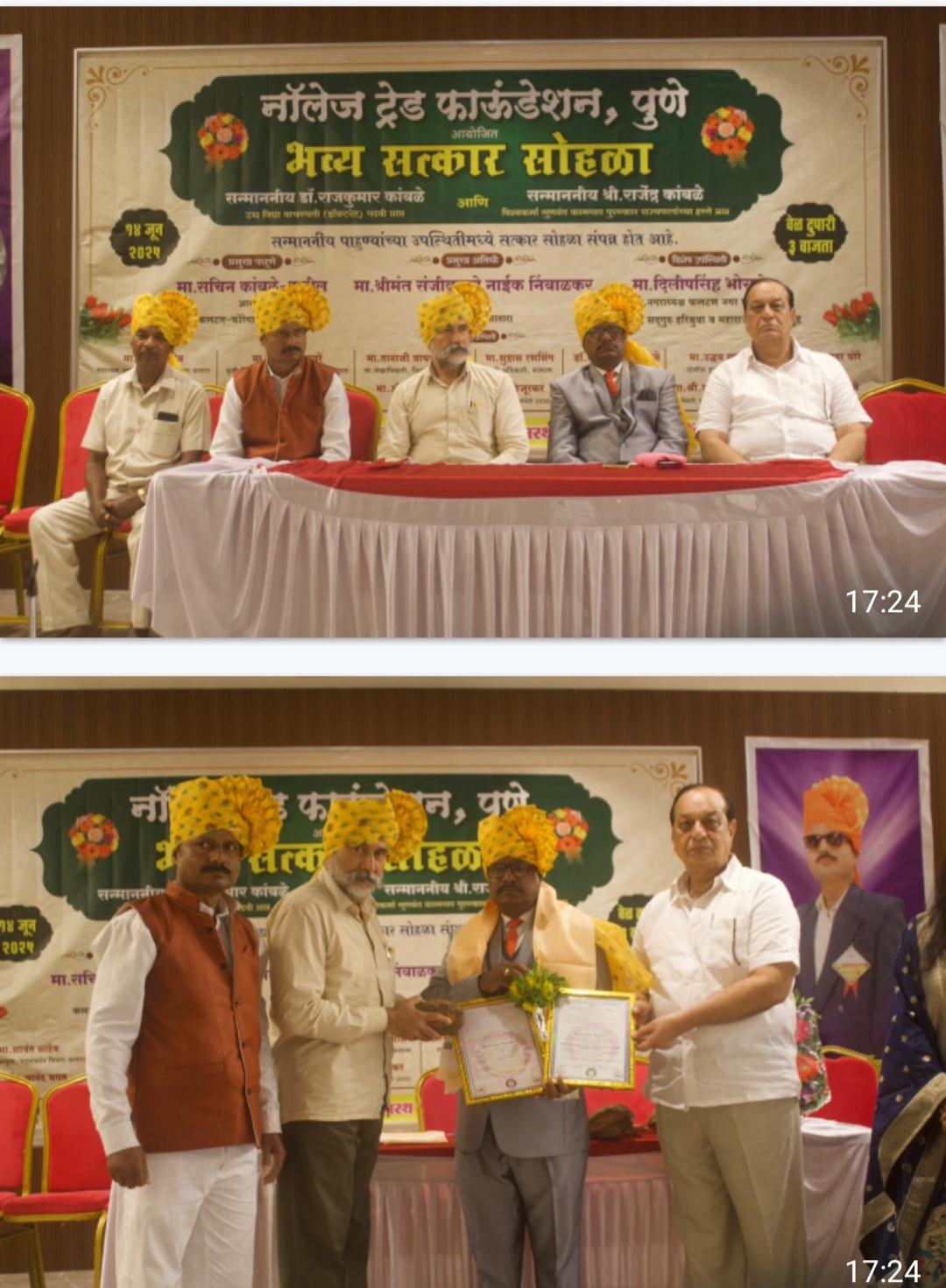 उरण (विठ्ठल ममताबादे )नॉलेज ट्रेड फाउंडेशन पुणे आयोजित फलटण नजीक साईरत्न हॉल फरांदवाडी येथे संजीवराजे नाईक निंबाळकर अध्यक्ष जिल्हा परिषद सातारा,दिलीप सिंह भोसले नगराध्यक्ष नगरपरिषद यांच्या शुभहस्ते डॉ.राजकुमार ज्ञानदेव कांबळे उच्च विद्या वाचस्पती डॉक्टररेट पदवी प्राप्त व राजेंद्र ज्ञानदेव कांबळे यांना विश्वकर्मा गुणवंत कामगार पुरस्कार राज्यपाल हस्ते प्राप्त झाल्याने दोन बंधूंचा भव्य सत्कार सोहळा नुकताच संपन्न झाला त्यावेळी श्रीमंत संजीवराजे नाईक निंबाळकर उपस्थित होते त्यावेळी डॉ. राजकुमार कांबळे यांचा गौरव करतो फलटण तालुक्यात डॉक्टरेट एक पदवी आली तेही जागतिक स्तरावरून फलटण तालुक्याचे मान निश्चितच उंच झाली याचा संपूर्ण तालुक्याला अभिमान आहे ही पदवी मिळवणे फार अवघड आहे याच्या पाठीमागे खूप कष्ट आहेत आणि ते कष्ट कांबळे या कुटुंबाने घेतले याचेही फळ त्यांना मिळाले आहे त्यांचे दुसरे लहान बंधू राजेंद्र कांबळे यांनाही विश्वकर्मा गुणवंत कामगार पुरस्कार मा. राज्यपाल सी. पी. राधाकृष्णन यांनी सन्मानित करण्यात आले आहे म्हणजे त्यांचीही कार्याचे मोजमाप महाराष्ट्र सरकारने केले आहे अशा अष्टपैलू असणाराच हा पुरस्कार मिळवतो यांच्या कार्याची दखल महाराष्ट्र सरकारने घेतली हे दोन्हीही बंधू छोट्या खेडेगावी जन्माला येऊन त्यांची कार्याची दखल महाराष्ट्र सरकारने घेतली याच बरोबर अमेरिकेतील विद्यापीठांनी घेतली आहे याचा आम्हा फलटण वासीयांना अभिमान आहे डॉ. कांबळे यांना शेळीपालन या विषयात मिळाली आहे त्यामुळे त्यांच्या ज्ञानाचा शेतकऱ्यांना उपयोग होईल.आता ते प्रशिक्षण देत आहेतच पण अल्पवधीतच त्यांच्यामुळे शेतकऱ्यांना एक व्यवसाय मिळेल त्यामुळे शेतकऱ्यांचे उत्पन्न वाढेल शेळीपालन व्यवसायात वाढ होईल याची सुरुवात झाली आहे बेरोजगारांना रोजगार मिळेल व्यवसायिकांचे उत्पन्न वाढेल व्यावसायिक वाढतील अनेकांचा व्यवसाय होईल याचा मला विश्वास आहे त्यानंतर नगराध्यक्ष दिलीपसिंह भोसले यांनी मनोगत व्यक्त करताना या दोन्ही बंधूंचा सत्कार करतो त्यावेळी ते म्हणाले की डॉक्टर कांबळे यांच्या मार्गदर्शनाने अनेक व्यवसायिक घडत त्यांनी तेच काम सुरू केले आहे मलाही त्याचा अभिमान आहे त्यामुळे बंधू हे सामाजिक विचाराने प्रेरणे झालेले आहेत यांचा प्रवास खूप अडचणीचा आहे प्रतिकूल परिस्थितीत हे यश दोघांनीही खेचून आणले आहे असे मला वाटते खरेच हे कौतुकास्पात्र आहेत भिलकटी, वडजल, निंभोरे, या परिसरात माझाही संपर्क असतोच वडजल या ठिकाणी लवकरच इंग्लिश मीडियम स्कूलच्या इमारत इमारतीचे पूजन होईल त्यामुळे या परिसराचा विकास होणार आहे शेवटी पुढील वाटचालीस कार्यास डॉ.कांबळे व राजे