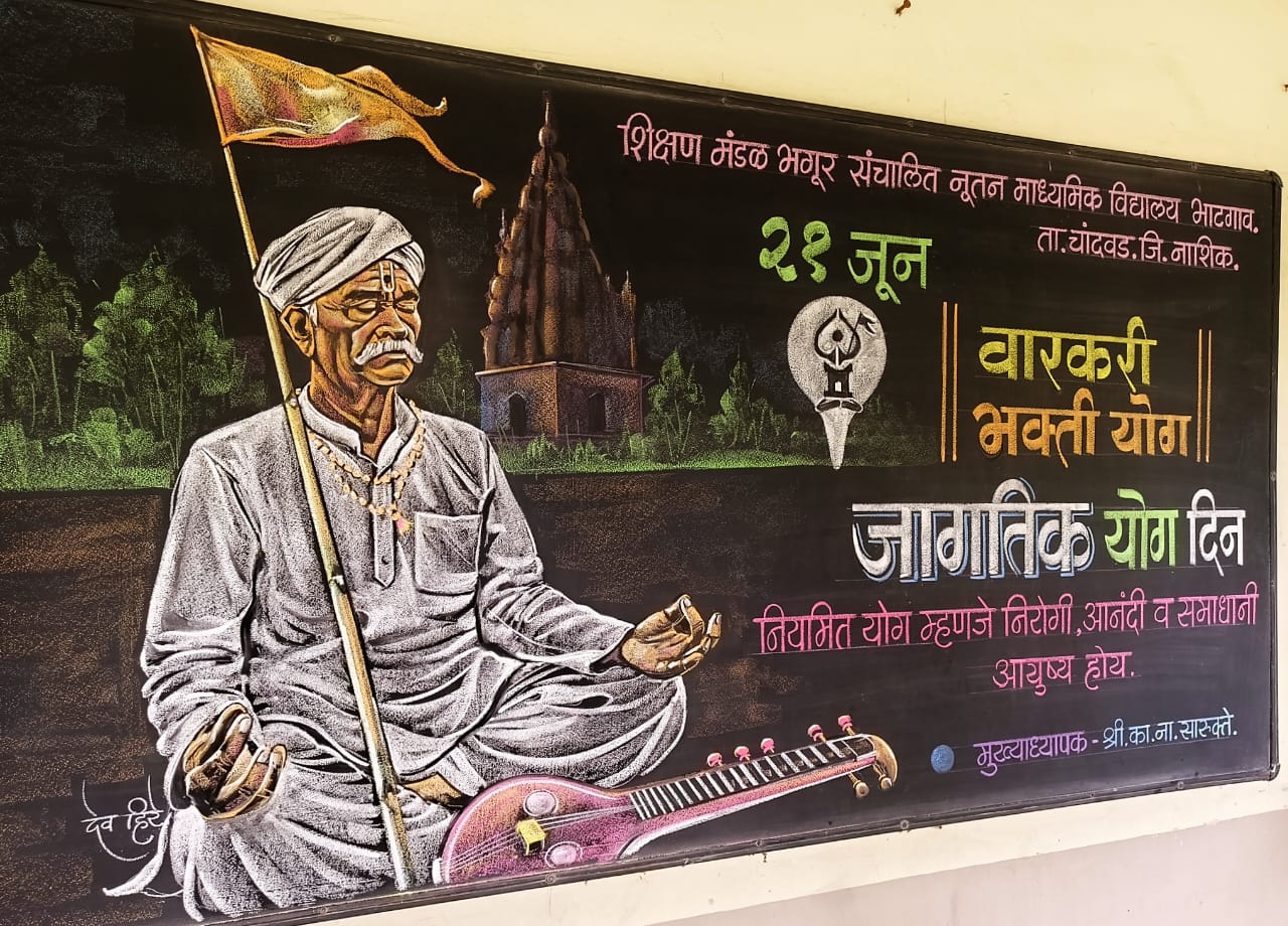 २१ जून हा दिवस जागतिक योग दिन म्हणून ओळखला जातो. शरीर,मन आणि आत्मा यांना एकत्रित आणून मोक्षाची किंवा मनःशांती ची अत्युच्च पातळी गाठणे म्हणजे ‘योग ‘ अशी योगाची आधुनिक व्याख्या केली जाते. योग मानवजातीसाठी मोठे वरदान आहे. आपल्या महाराष्ट्राला संत ,वारकरी संप्रदायाचा वारसा लाभला आहे. पांडुरंगाच्या भेटीला संत ज्ञानेश्वर महाराज व संत तुकाराम महाराज यांचा पायी पालखी सोहळा निघाला आहे. योगायोग म्हणजे २१ जून योग दिनाच्या दिवशी पुणे येथे या पालख्या व लाखो वारकरी भाविकांसह १२०० पायी दिंड्या एकत्र येऊन योगाभ्यास करणार आहेत.योग दिनाच्या दिवशी हा अभिनव योगवरीचा *वारकरी भक्तीयोग* सोहळा व योगिनी स्मार्त एकादशी चा योग म्हणजे भक्तियोगाचा दुग्धशर्करा योग आहे. शालेय दर्शनी फळ्यावर रंगीत खडू फलक रेखाटनातून वारकरी संप्रदयासह सर्वांना योग दिनाच्या हार्दिक शुभेच्छा !