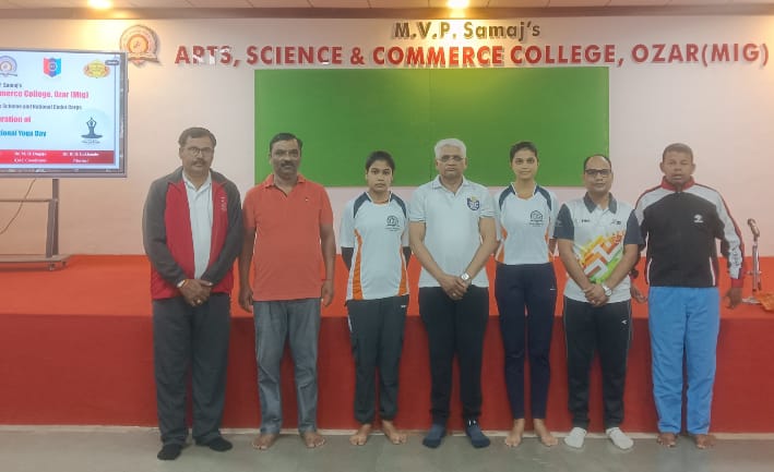 नाशिक: (प्रतिनिधी) मविप्र समाजाचे कला विज्ञान व वाणिज्य महाविद्यालय ओझर मिग व राष्ट्रीय सेवा योजना विभाग(D-14) येथे अकरावा आंतरराष्ट्रीय योग दिन उत्साहात साजरा करण्यात आला. यावेळी उपस्थित महाविद्यालयाचे प्राचार्य सर्व सहकारी प्राध्यापक व कर्मचारी वर्गाने प्राणायाम व योगासनांचा उत्साहपूर्ण वातावरणात सराव केला. याप्रसंगी प्राचार्यांनी प्राणायाम योगा व व्यायामाचे महत्त्व विद्यार्थ्यांना पटवून दिले.
