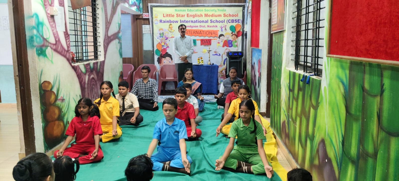 नांदगाव (प्रतिनिधी)दिनांक २१ जून रोजी जागतिक योग दिनानिमित्त संस्थेचे अध्यक्ष श्री.संजय बागुल सर व उपाध्यक्ष सौ.सरिता बागुल मॅम यांच्यातर्फे योग दिनाचे विशेष नियोजन करण्यात आले होते.या वेळी संस्थेचे अध्यक्ष ,उपाध्यक्ष,श्री. सार्थक बागुल,स्कुलचेप्रिन्सिपल मिस. वासंती नटराजन मॅम,स्पोर्ट टीचर मिस.मयुरी क्षीरसागर यांच्या हस्ते कार्यक्रमाची सुरुवात सरस्वती पूजनाने करण्यात आली. योगा दिनाचे महत्त्व मिस. नेहा मॅम व मिस माया मॅम आणि इ.६ वीची विद्यार्थ्यांनी कु. समृद्धी मोरे या सर्वानी उत्तम रितीने सांगितले. रेनबो स्कूलचे इ.५ वी व ६ वी च्या विद्यार्थ्यांचे सिटीग आणि स्टँडींग आसनाचे विविधांगी प्रकार विद्यार्थ्यानी सादर केले