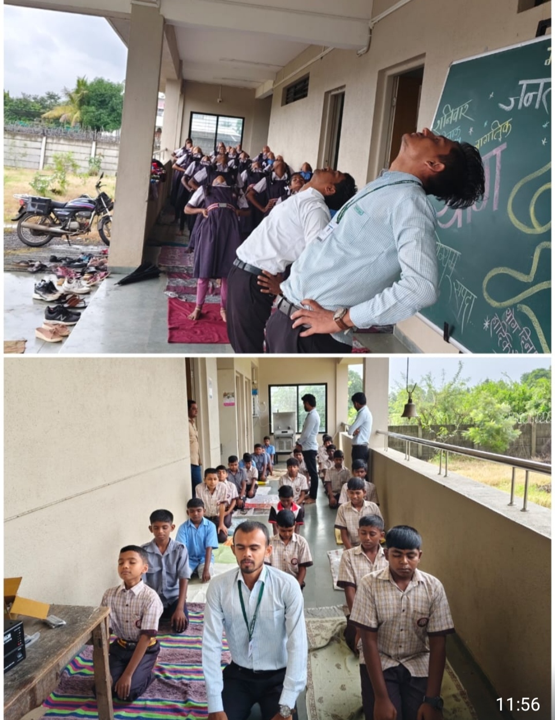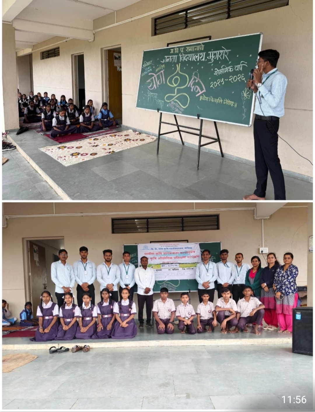 मुंगसरे, नाशिक:-(प्रतिनिधी )अंतरराष्ट्रीय योग दिनाच्या निमित्ताने जनता विद्यालय मुंगसरे येथे योग दिन कार्यक्रमाचे आयोजन करण्यात आले. “योगा फॉर सेल्फ अँड सोसायटी” या विषयावर आधारित हा कार्यक्रम विद्यार्थ्यांमध्ये आरोग्यविषयक जागरूकता निर्माण करण्यासाठी राबविण्यात आला. के. के. वाघ कृषी महाविद्यालय नाशिक च्या अंतिम वर्षातील विद्यार्थी मयूर रायसिंग, महेशकुमार पाटील, अंगत पाटील, पियुष पवार, ओमकार संधान, अविष्कार संधान आदित्य राजपूत या विद्यार्थ्यांनी मिळून संपूर्ण कार्यक्रमाचे नियोजन, सहकार्य, आणि संचालन अत्यंत शिस्तबद्ध पद्धतीने केले. योग सत्रात विविध योगासनांचे सादरीकरण करण्यात आले ज्यात सूर्यनमस्कार ताडासन वृक्षासन भुजंगासन आणि श्वसन प्रक्रियेचे महत्त्व विद्यार्थ्यांना शिकवले गेले.