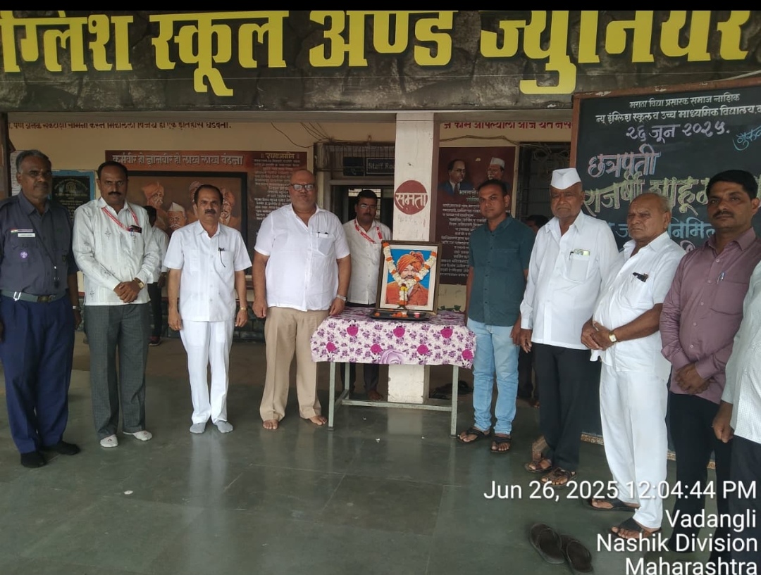 वडांगळी..(प्रतिनिधी)… मराठा विद्या प्रसारक समाज संस्था संचलित न्यू इंग्लिश स्कूल उच्च माध्यमिक विद्यालय वडांगळी या विद्यालयात छत्रपती राजर्षी शाहू महाराज यांच्या जयंतीनिमित्त त्यांच्या विनम्र स्मृतींना अभिवादन करण्यात आले. सदर कार्यक्रमाच्या अध्यक्षस्थानी माध्यमिक शालेय समितीचे अध्यक्ष सुदेश दादा खुळे हे होते. यावेळी व्यासपीठावर अभिनव बाल विकास मंदिर शालेय समितीचे अध्यक्ष भाऊसाहेब चव्हाणके, शालेय समितीचे सदस्य बबनराव चव्हाणके, विक्रम माधवराव खुळे, मुख्याध्यापक बाळासाहेब खैरनार, पर्यवेक्षक मच्छिंद्र धातडक, कैलास काळे, भाऊसिंग पंढुरे, बाळासाहेब अडसरे, रवींद्र हांडगे आदी उपस्थित होते.