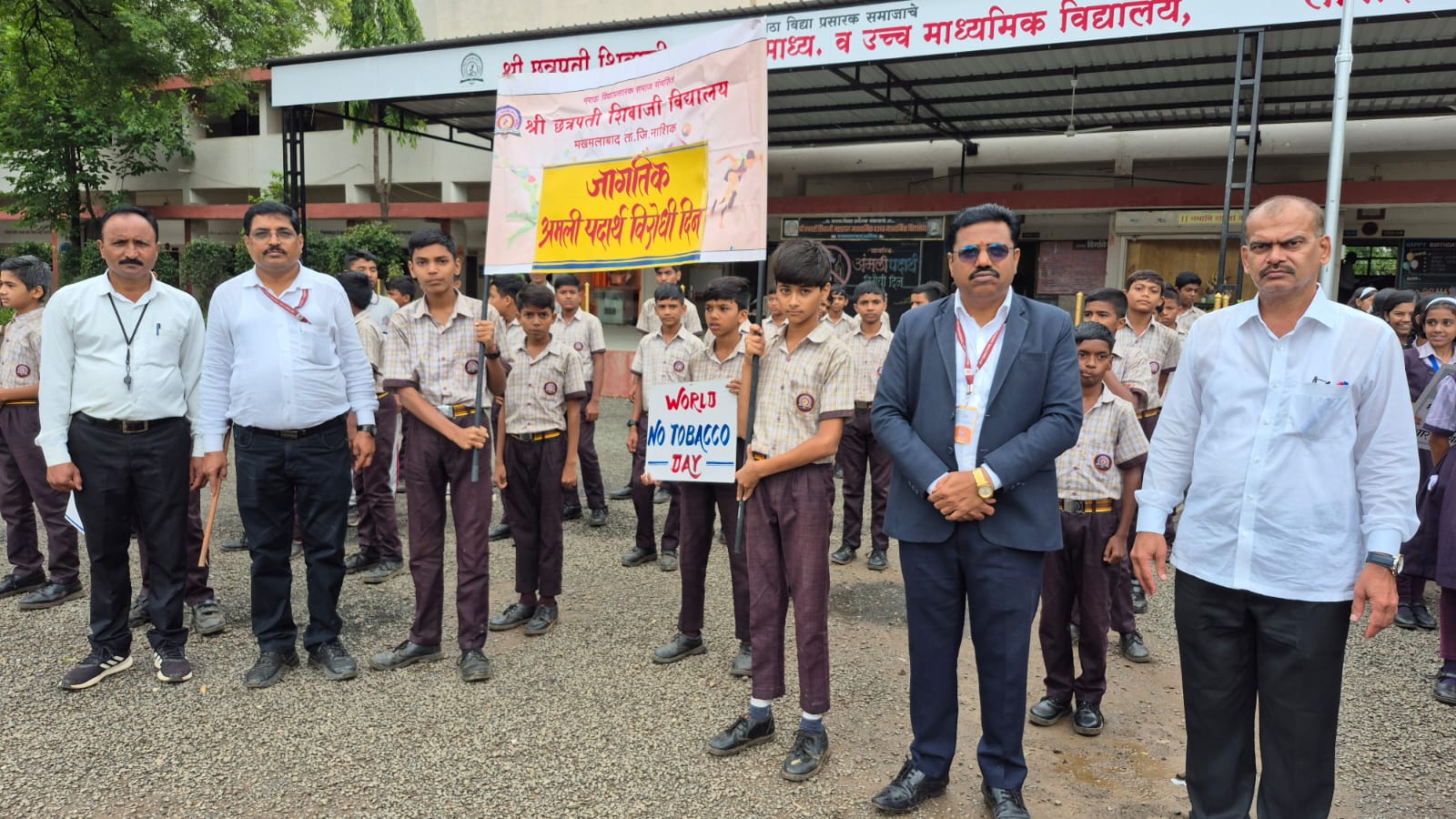 मखमलाबाद विद्यालयात अमली पदार्थ सेवन विरोधी दिनानिमित्त प्राचार्य संजय डेर्ले,पर्यवेक्षक सुनील पाटील,ज्येष्ठ क्रीडाशिक्षक अनिल पगार,शरद आहेर,सर्व शिक्षकवृंद,शिक्षकेतर कर्मचारी व विद्यार्थी.
