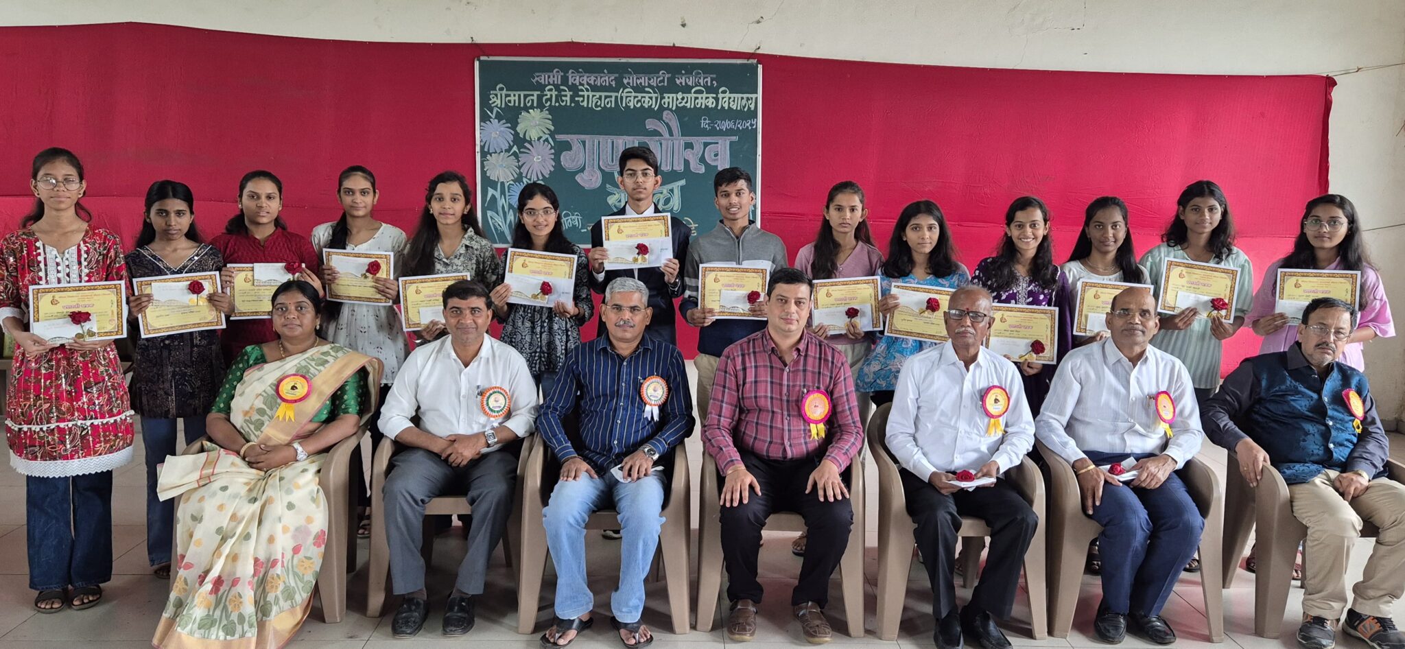 नाशिक (प्रतिनिधी ) स्वामी विवेकानंद सोसायटी संचलित श्रीमान टी. जे. चौहान (बिटको) माध्यमिक विद्यालय मोरवाडी या विद्यालयात माध्यमिक शालांत परीक्षेत उत्तुंग यश मिळवलेल्या गुणवंतांचा गौरव सोहळा मोठ्या थाटात पार पडला.यावेळी व्यासपीठावर प्रमुख पाहुणे म्हणून प्रथितयश पत्रकार श्री. प्रवर देशपांडे, शालेय समिती सदस्य सुरेश डोळसे, ॲड. परमानंद पाटील, देणगीदार बाळकृष्ण पवार ,रमेश वडनेरे, विद्यालयाच्या मुख्याध्यापिका उज्वला माळी, पर्यवेक्षक कीर्तिकुमार गहाणकरी उपस्थित होते.स्वागतगीताने मान्यवरांचे स्वागत करण्यात आले. त्यानंतर विद्यादेवी शारदा व स्वामी विवेकानंद यांच्या पवित्र प्रतिमांचे पूजन पाहुण्यांनी केले. विद्यालयातील गीतमंचाने सुरेल ईशस्तवन सादर केले.पाहुण्यांचा परिचय पुष्कर सोनवणे या विद्यार्थ्याने केला.विद्यालयाच्या मुख्याध्यापिकांनी आपल्या प्रास्ताविकातून विद्यालयाच्या उज्वल यशाची व गुणवंत विद्यार्थ्यांनी केलेल्या अथक परिश्रमाची माहिती दिली व १००% निकाल जाहीर करून गुणवंत विद्यार्थ्यांचे अभिनंदन केले .प्रमुख पाहुण्यांनी गुणवंत विद्यार्थ्यांचा गौरव केला त्यामध्येप्रथम – गौरी गामनेरामकेश प्रजापती.द्वितीय -देवयानी चव्हाण तृतीय- प्रिया शेळके चतुर्थ – प्रणाली कुवर राजश्री चव्हाण श्रद्धा बोराडे पाचवी – साक्षी शेंडे ईश्वरी सावंतयांचा समावेश होता. त्यानंतर प्रमुख पाहुण्यांनी व व मान्यवरांनी विषयात प्रथम आलेल्या विद्यार्थ्यांचा आपल्या शुभ हस्ते गौरव केला यावेळी गुणवंत विद्यार्थ्यांची मनोगते सादर झाली. गौरी गा मणे, रामकेश प्रजापती श्रद्धा बोराडे या विद्यार्थ्यांनी आपल्या मनोगतातून आपली यशोगाथा आणि शाळेबद्दलचे ऋण व्यक्त केले. कविता चव्हाण, अंतराम प्रजापति या पालकांनी आपले मनोगतातून गुणवंत विद्यार्थ्यांचे अभिनंदन केले.व शाळेबद्दल समाधान व्यक्त केले .प्रमुख पाहुण्यांनी गुणवंतांचे अभिनंदन केले व साधना करण्यावर भर दिला त्याचबरोबर संकल्पना समजून अभ्यास निश्चित केल्यास यश नक्की प्राप्त होते तसेच साधना ,समर्पण ,आणि संस्कार या तीन तत्त्वांचा अंगीकार करण्याचा संदेश त्यांनी आपल्या मनोगतातून दिला .मुख्याध्यापिका उज्वला माळी यांनी आपल्या शुभ हस्ते स्वामी विवेकानंदांची छोटीशी प्रतिमा देऊन प्रमुख पाहुण्यांचे व इतर मान्यवरांचे आभार मानले. या सोहळ्याची सांगता अभंगवाणीने झाली. सृष्टी शिंदे, धनश्री हिरे पुष्कर सोनवणे या विद्यार्थ्यांनी अतिशय बहारदार सूत्रसंचालन केले. सर्व शिक्षक शिक्षकेतर कर्मचाऱ्यांनी कार्यक्रम यशस्वीतेसाठी परिश्रम घेतले.