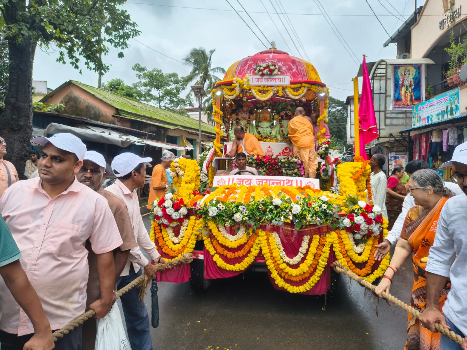 जगन्नाथ कोण?अतिशय सोप्या, समर्पक भाषेत अभय गौरांग प्रभूंनी जगन्नाथ, बलराम व सुभद्रादेवी यांच्या स्वरूपाचे विवेचन केले. आध्यात्मिक जीवन कसे सोपे,आनंददायी आणि आवश्यक आहे हे पटवून दिले.भाविक मंत्रमुग्ध होऊन ऐकत होते.🎶 सांस्कृतिक, भक्तीमय कार्यक्रमरथयात्रा मार्गावर लहान मुलांचे सांस्कृतिक कार्यक्रम, गीत-नृत्य सादर झाले.महिला भक्तांची विशेष गर्दी हे यंदाचे वैशिष्ट्य ठरले.सर्वत्र हरिनाम संकीर्तन:> “हरे कृष्ण हरे कृष्ण कृष्ण कृष्ण हरे हरेहरे राम हरे राम राम राम हरे हरे”या महामंत्राच्या गजरात मृदंग, करताल व अन्य वाद्यांच्या तालावर भाविकांनी आनंदात नृत्य केले.🍛 ५६ भोग व महाप्रसादरथ प्रगती प्रतिष्ठान येथे पोहोचल्यावर श्री जगन्नाथ, बलराम, आणि सुभद्रा माई यांना ५६ भोग अर्पण करण्यात आले. त्यानंतर भावपूर्ण महाआरती पार पडली. सर्व भाविकांना महाप्रसाद देण्यात आला.