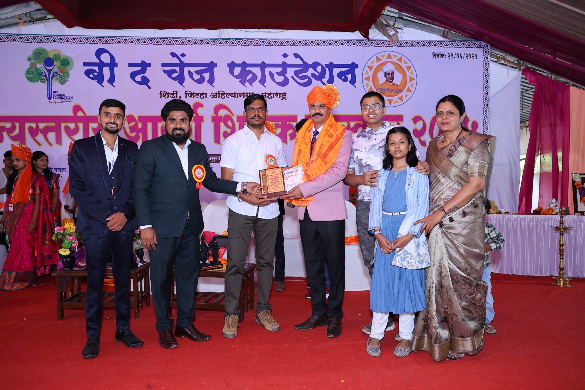 प्राचार्य डॉ . ज्ञानोबा ढगे यांना बी द चेंज फाऊंडेशन शिर्डी, आहील्यानगर येथे, महाराष्ट्र राज्य सहकारी पतसंस्था महासंघाचे अध्यक्ष ओमप्रकाश कोयटे आणि हिवरे बाजार येथील प्रसन्न पोपटराव पवार यांच्या हस्ते राज्यस्तरीय आदर्श शिक्षक पुरस्कार देतांना