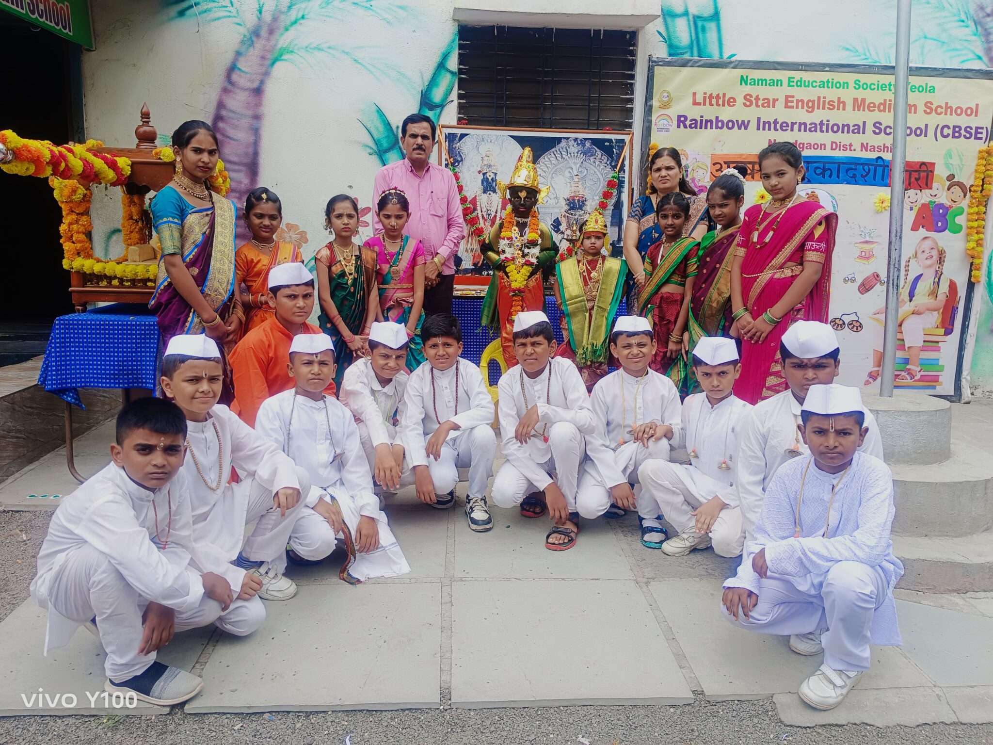 नांदगाव (प्रतिनिधी)…दिनांक ५ जुलै रोजी आषाढी एकादशी दिनानिमित्त संस्थेचे अध्यक्ष श्री.संजय बागूल सर व उपाध्यक्ष सौ.सरिता बागूल मॅम यांच्यातर्फे एका अनोख्या आषाढी दिनाचे उत्तम नियोजन करण्यात आले होते.या वेळी मा.मॅनेजमेंट श्री.सार्थक बागूल,स्कूलचे प्रिन्सिपल मिस.वासंती नटराजन मॅम यांच्या हस्ते विठ्ठल व रुक्मिणीच्या प्रतिमेचे पूजन करण्यात आले.त्यानंतर पालखीचे पूजन झाल्यानंतर विठ्ठल रुक्मिणीच्या वेशात आलेल्या चि.शिवांश खैरनार चि.शिवांश चौधरी चि.विनीत पांडे कु.सिया खैरनार व कु.मयुरी शिंदे या विद्यार्थ्यांची देखील भगवंत स्वरुप पूजा करण्यात आली.