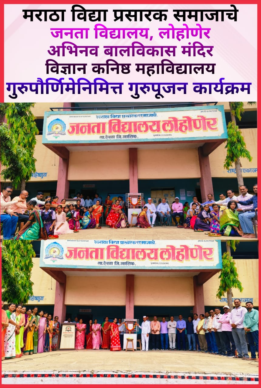 लोहोणेर-: येथील मराठा विद्या प्रसारक समाज संस्थेच्या जनता विद्यालयात गुरू शिष्याची महती सांगणारी गुरुपौर्णिमा मोठ्या उत्साहात साजरी करण्यात आली.कार्यक्रमाची सुरुवात व्यासमुनींच्या प्रतिमा पूजनाने करण्यात आली. अध्यक्षस्थानी मुख्याध्यापिका के.ए.शिंदे होत्या तर पर्यवेक्षक आर.एच देसले यांच्यासह शिक्षकवृंद व्यासपीठावर उपस्थित होते.विद्यालयाची विद्यार्थिनी वैदही एखंडे हिने गुरुवंदना सादर केली.त्यानंतर विद्यालयातील पाचवी ते दहावीच्या वर्ग प्रतिनिधींनीच्या हस्ते गुरुजनांचे चरण पूजन करत गुलाबपुष्प व पेन देऊन सत्कार करण्यात आला. सांस्कृतिक समिती प्रमुख सुनिल एखंडे यांनी प्रास्ताविकातून गुरुपौर्णिमा साजरा करण्यामागचा हेतू स्पष्ट केला. यावेळी विद्यार्थिनी वैष्णवी भामरे व अक्षदा सुर्यवंशी यांनी गुरुंविषयी महत्त्व व महती आपल्या मनोगतातून व्यक्त केली. शेवटी मुख्याध्यापिका के. ए. शिंदे यांनी अध्यक्षीय भाषणात गुरूंचे आपल्या जीवनात असलेले स्थान व महत्व विशद करत प्रत्येकाने आपल्या जीवनात कोणाला तरी गुरू मानून त्यांचे आचार व विचार जीवनात आत्मसात केले तर आपले ध्येय सहज साध्य करता येईल असे प्रतिपादन केले.सूत्रसंचालन व आभार सांस्कृतिक समिती प्रमुख सुनिल एखंडे यांनी मानले.कार्यक्रम यशस्वीपणे पार पाडण्यासाठी सर्व शिक्षक व शिक्षकेत्तर सेवक वृंदांनी सहकार्य केले.कार्यक्रमाचे नियोजन सांस्कृतिक समितीच्या वतीने करण्यात आले.